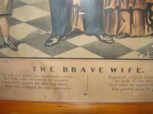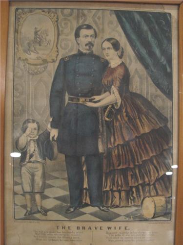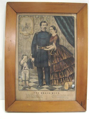 CURRIER & IVES CIVIL WAR SOLDIER PRINT. Titled "The Brave Wife". Depicts a Union officer with wife and child. In pine frame. Shows some signs of water staining. 12.5" x 16.5" framed