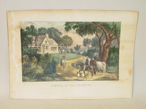 CURRIER & IVES COLORED LITHOGRAPH PRINT "SUMMER IN THE COUNTRY"-(RESTRIKE) UNFRAMED (11 7/8" X 16") - TONING, FOXING & STAIN