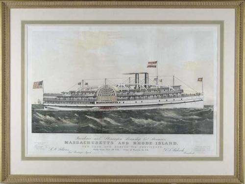 CURRIER & IVES (Publisher, 19th Century) “PADDLEWHEEL STEAMSHIP MASSACHUSETTS”. Listed in Conningham’s checklist as no. 4688. A large folio lithograph showing the side wheel steamship Massachusetts sailing left to right in green ocean. The legend indicates it is from the Providence and Stonington Steamship Company and ran between New York and Boston via Providence. Housed in a fine reproduction gilt frame with wide watercolor matte. SIGHT SIZE: 23-3/4” x 35”. IMAGE SIZE: 19” x 33-1/2”. CONDITION: Not examined out of frame. Restoration to multiple tears which go into the image. Fair to good. 9-27694