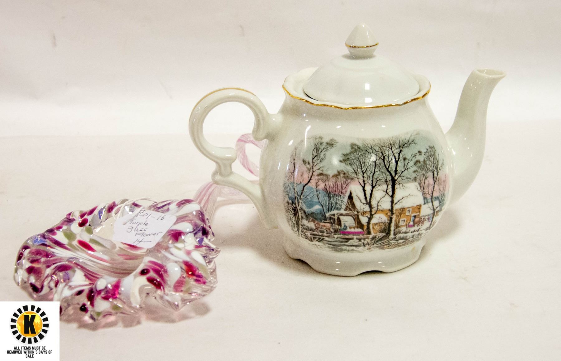 AWARD TEA POT AND BLOWN GLASS FLOWER **ALL ITEMS MUST BE REMOVED BY 5PM SATURDAY, NOVEMBER 4TH 2023. ALL REMAINING ITEMS WILL BE SUBJECT TO A $6.00 PER DAY STORAGE CHARGE. ANY ITEMS REMAINING AFTER MONDAY, NOVEMBER 18TH, 2023 WILL BE CONSIDERED FORFEITED. NO REFUNDS WILL BE ISSUED FOR FORFEITED ITEMS. TO SCHEDULE A PICK UP APPOINTMENT CLICK HERE