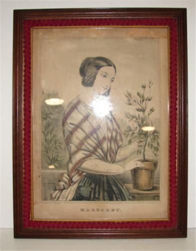 CURRIER “MARGARET” HAND COLORED LITHOGRAPH. In contemporary frame. Overall foxing and tape damage at top right. 12.25” x 16” overall with frame.