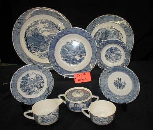 CURRIER & IVES BLUE & WHITE SERVICE FOR 8 INCLUDES (1) 12in CHOP PLATE inGETTING ICEin HORSE DRAWN SLEIGH, (8) 10 1/2in DINNER PLATES inTHE OLD GRIST MILLin, (8) 8 1/2in BOWL inEARLY WINTERin, (8) 6 3/8in BREAD PLATE inHARVESTin, (4) 6 1/8in SAUCERS inLOW WATER IN MI
