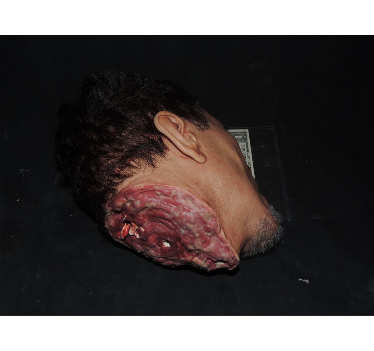 This is absolutely keeper quality gore! It is all silicone with acrylic eyes and teeth. Every single hair on this head is Hand punched!