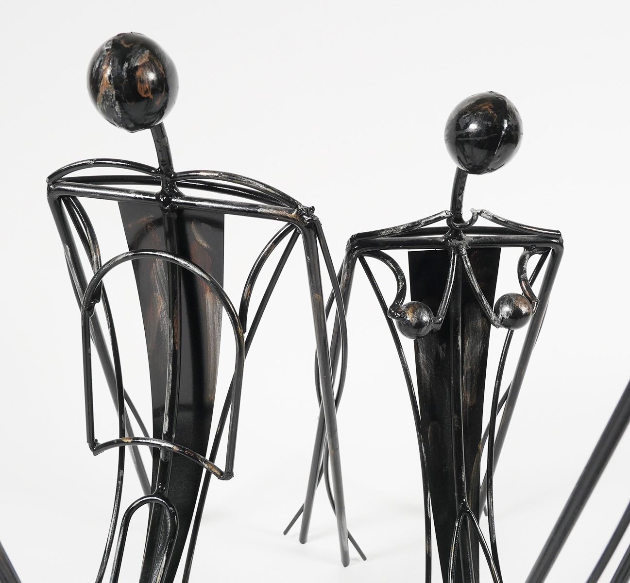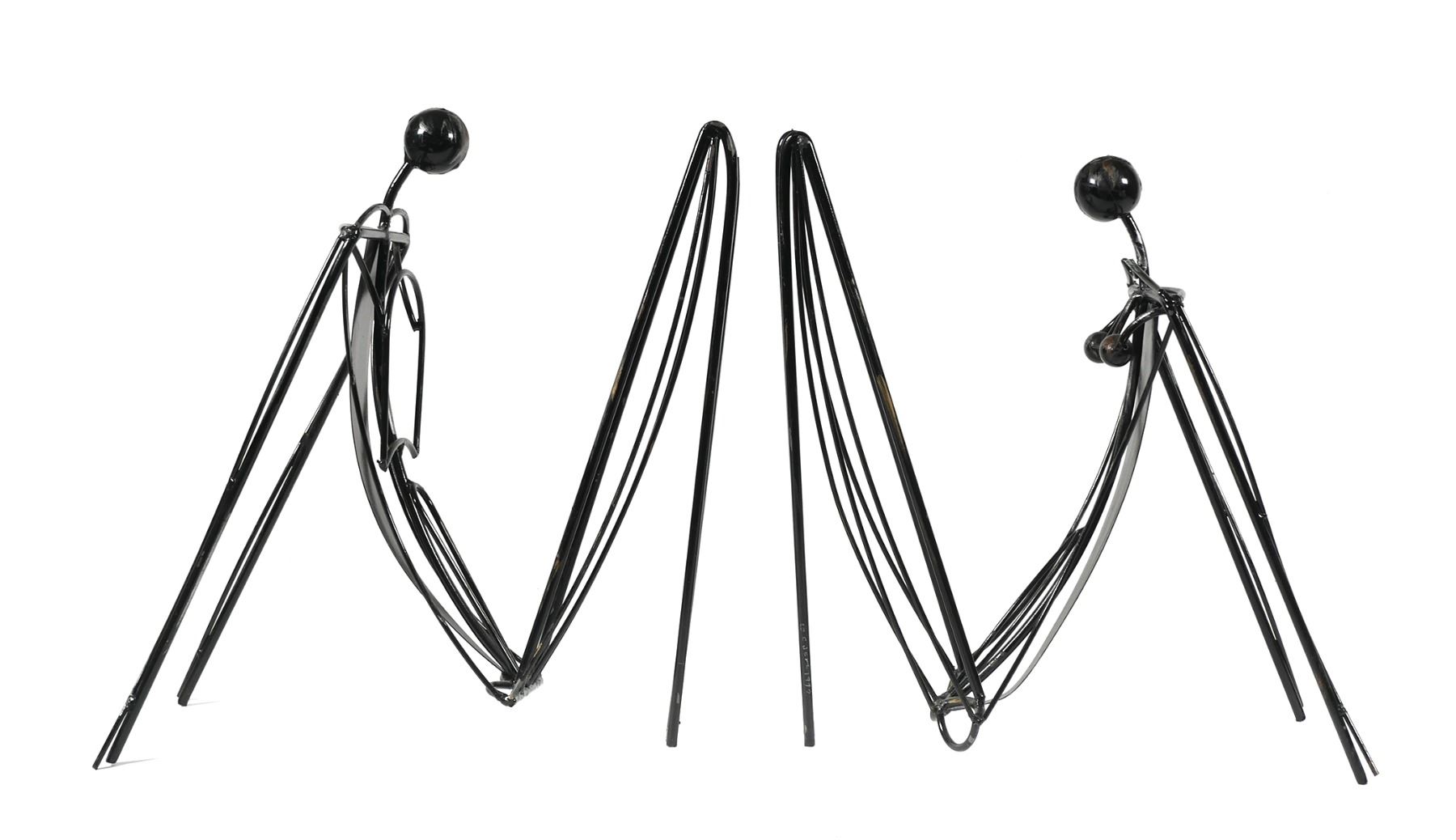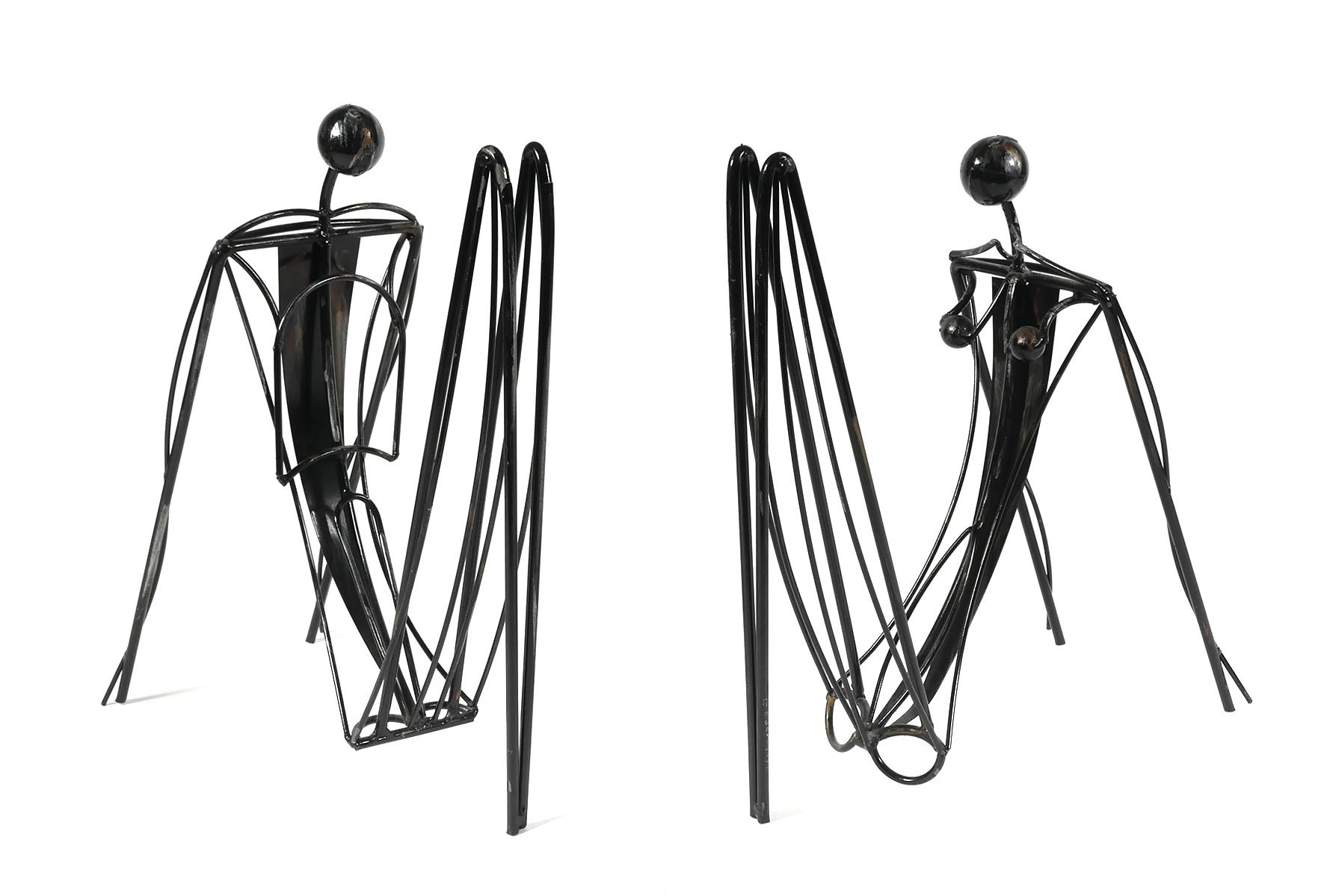 Vintage abstract tabletop art sculptures, each signed C. Jere near a foot. One depicts man, the other a woman. Each measures about 14" high.