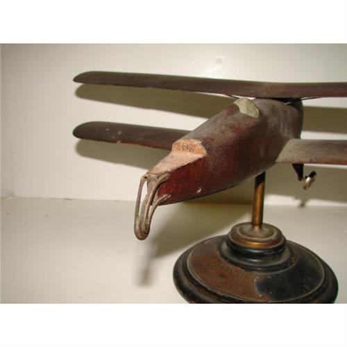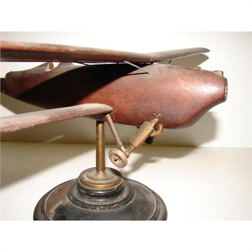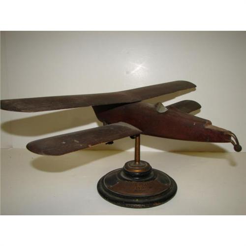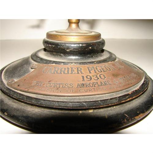 CURTISS AEROPLANE & MOTOR COMPANY WOODEN AIRPLANE MODEL. Wooden airplane model of a Carrier Pigeon II (1930) airplane on an ebonized wooden base. Airplane is missing part of tail, propeller, and one front wheel. Wooden wings show some small areas of wear and aging. Base is marked with brass plate that reads “Carrier Pigeon II/1930/The Curtiss Aeroplane & Motor Co./Division of Curtiss-Wright Corp.” 7.75” H, 13” L, 19” W