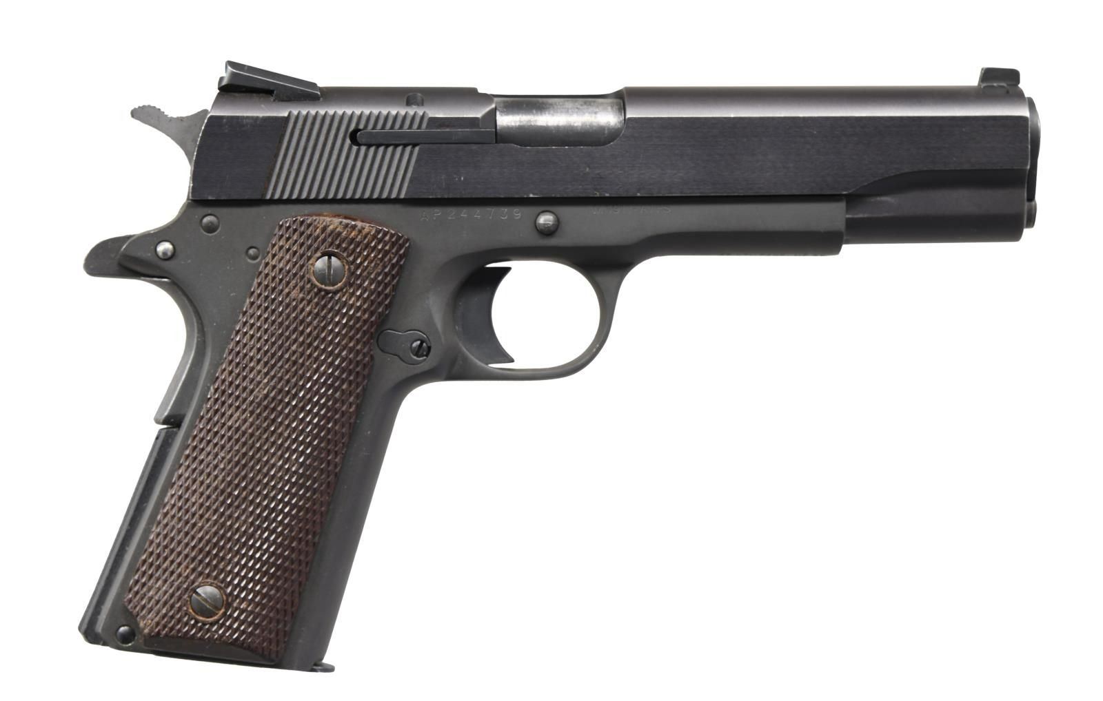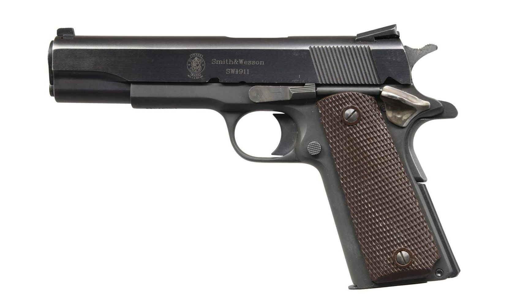 Cal. 45 ACP. S# AP244739. Bbl. 5". Three dot sights w/ Novak style rear. Custom assembled 1911 style pistol w/ blued S&W slide & parkerized Armscor frame. Checkered GI style brown checkered grips. MAGS: 1-7 rd. CONDITION: safety is mostly a smoky gray patina. Other aspects rate very good w/ light slide stop reassembly mark on frame, scattered handling, operational & edge wear. (23-6914/MJC). MODERN. $600-900.
