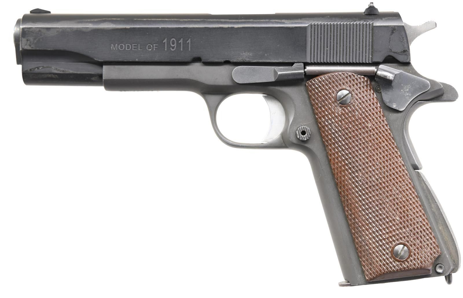 Cal. 45 ACP. S# AP244735. Bbl. 5". Serrated blade front sight. Square notch rear sight. GI style 1911 pistol using an Armscor frame & other parts. GI style safety that is not engaging & may require attention. Frame has gray parkerized finish. Slide is marked "MODEL OF 1911" on left side & has matte black finish. GI style brown checkered grips. MAGS: 1-7 rd. CONDITION: grips show some chipped points & handling wear. Slide shows scattered edge wear, oxidation & dried grease. Frame shows scattered edge & operational wear. Bore shows some light pitting & scattered frosting but strong rifling. (23-6917/MJC). MODERN. $600-900.