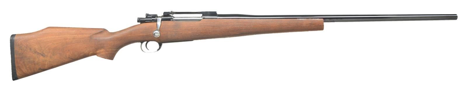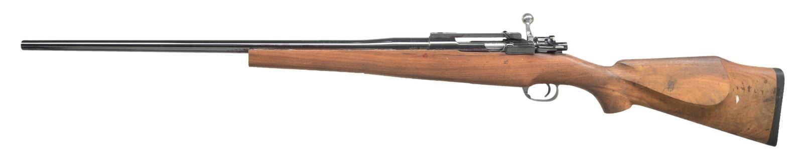 (TOKYO ARSENAL) TYPE 46 ACTION. Cal. 45-70. S# 131. Bbl. 26" w/out sights. Markings on receiver have been obscured by polishing & Redfield 1 piece base. Turned down bolt handle & low swing safety. Replacement partially finished hardwood pistol grip stock w/ cheekpiece & black recoil pad. CONDITION: good reblue metal finish w/ red staining. Good wood finish w/ missing forearm tip, grip cap & unfinished wood w/ stains. Near excellent bore. (22-2586/MD). MODERN. $100-200.