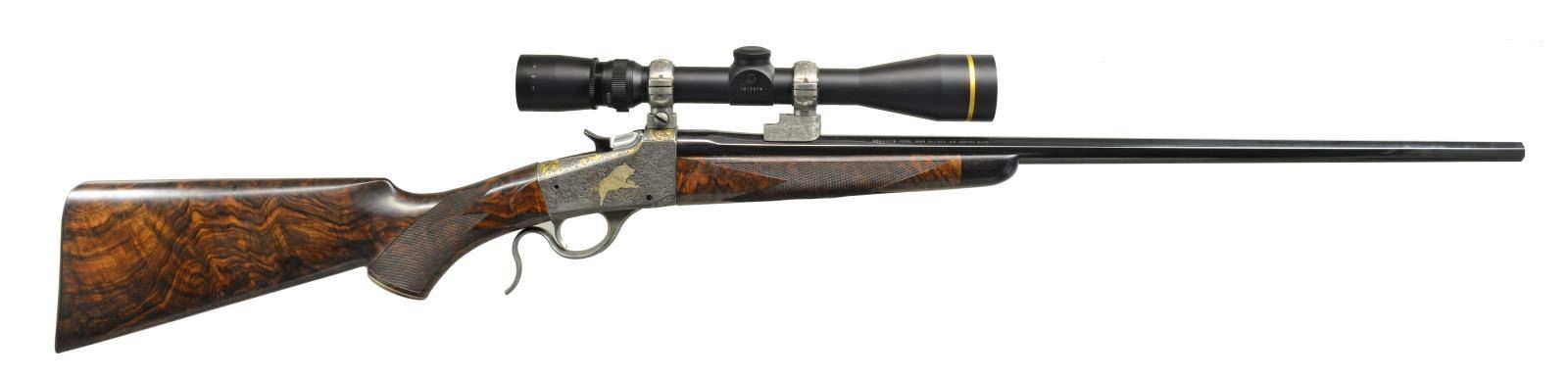 ENGRAVING & GOLD INLAY & STRIKING CLASSICALLY STYLED STOCKS W/ SCOPE. Cal. 22 Hornet. S# 04513NR2L7. Standard barreled action w/ 24" octagon bbl. has been augmented into this attractive creation. Action is engraved w/ near full coverage exceptionally well cut & nicely shaded varying sized scroll. Receiver ring & top part of action has central whirls & outlines of this scroll inlaid in gold. Sides of action are also inlaid w/ precious metals depicting game animals w/ bulino detailed gold bugling elk on left side & bounding platinum timberwolf on right. Opening lever has gold wire inlay on sides & more scroll engraving in front of Browning elk logo in gold. All of this fine engraving appears to be the work of Thierry Duguet (no signature found). Bbl. & action are fitted w/ Burris scope mounts & rings engraved to match. Rings hold a Leupold Vari X-III 4.5-14x scope w/ duplex reticle. Buttstock of exhibition grade wildly marbled & figured European walnut by Darwin Hensley measures 13 7/8" over blued steel buttplate which is unengraved. Stock features sm. shadowline right hand cheekpiece, point pattern checkering at grip & line border gold inlaid skeleton style grip cap. Matching forend w/ ebony tip attaches to bbl. w/ engraved screw through engraved oval escutcheon. CONDITION: very fine, showing limited use w/ a few minor marks in all wood & metal surfaces. Forend shows a bit of carrying wear. Scope is also very fine, optically clear. PROVENANCE: From the Frederic W. Thrane Collection. (20-2450/MGM41). MODERN. $3,000-5,000.