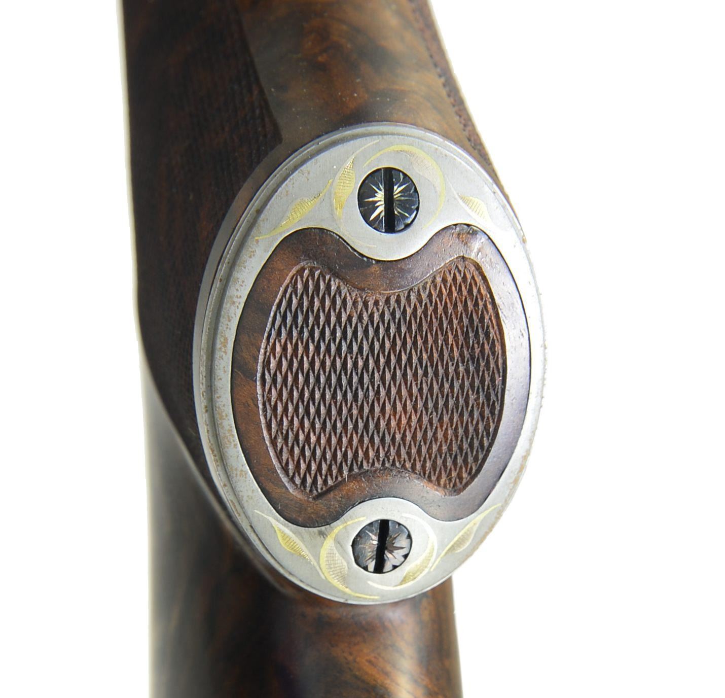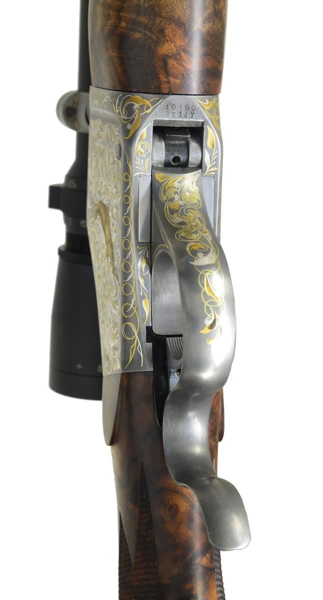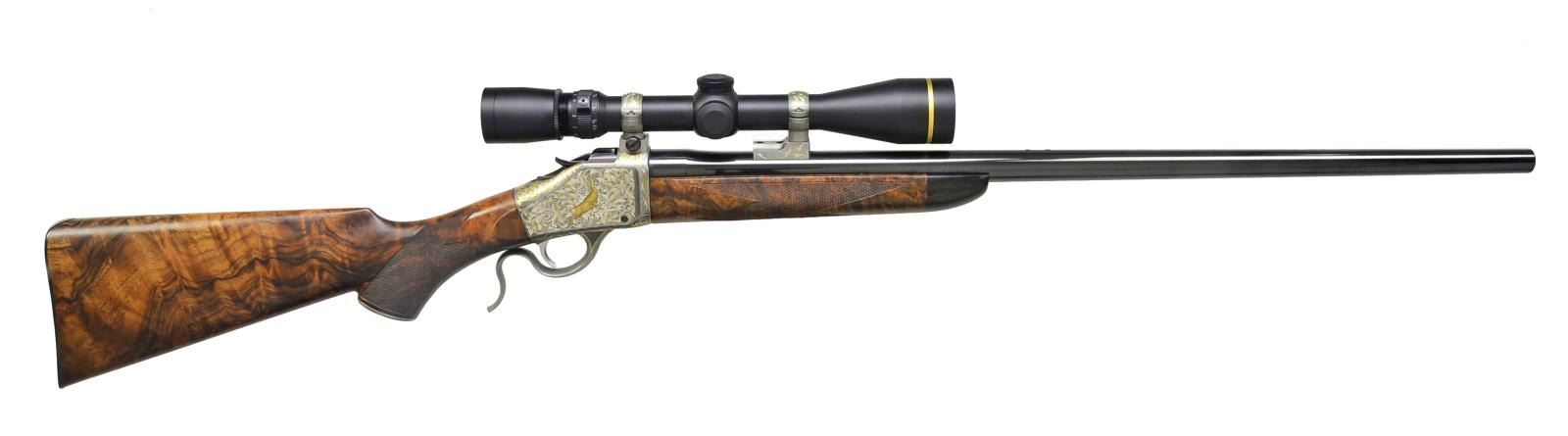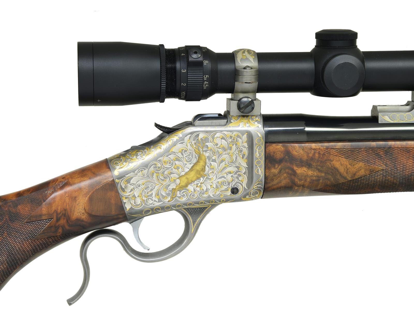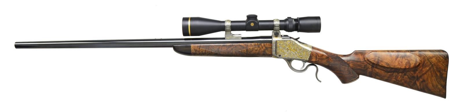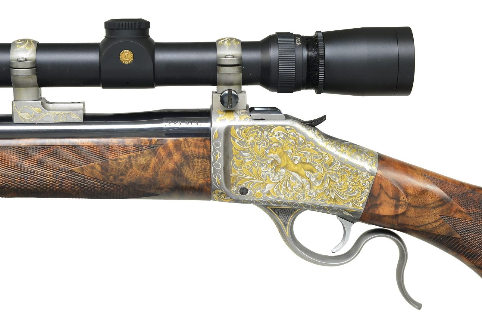 STOCK WORK BY DARWIN HENSLEY, ENGRAVED BY THIERRY DUGUET, W/ SCOPE. Cal. 225 Win. S# 10190RT147. 26" Heavyweight rnd. bbl is drilled & tapped for scope blocks. Coin finished Browning 1885 "high wall" action is engraved w/ near full coverage background of superbly detailed gold & platinum flush inlaid acanthus scroll. On left side of action, foliage is in gold w/ stems & central whorls of platinum; this is reversed on right. Superimposed on this background are flush gold & platinum inlaid leaping fox on left & mule deer on right. This fine inlay is brought to life by superb bulino shading. Buttstock of exhibition quality finely marbled & stump figured European walnut measures 14" over unengraved blued steel buttplate. Stock features sm. shadowline right hand cheekpiece, which sits high onto comb, elongated side panels behind action flats, skeleton steel grip cap, & very well cut borderless point pattern checkering at grip. Matching forend has ebony tip. A Leupold Vari X-III 4.5-14x scope w/ duplex reticle is in Burris mounts & rings engraved to match action. CONDITION: exceptionally fine, close to "as new" w/ some light carrying wear on forend & a few scattered light handling marks in wood finish, most notably a small repaired scratch on left side near action. Bore is excellent. Scope is excellent w/ clear optics. PROVENANCE: From the Frederic W. Thrane Collection. (20-2451/MGM43). MODERN. $3,000-5,000.