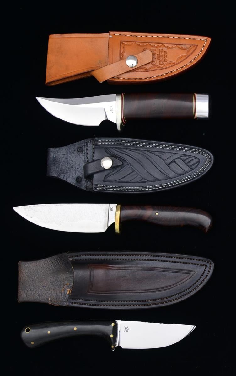 1) LOWELL COBB SKINNER. Blade: 4 1/4". Overall: 8 7/8". Hilt w/ finger guard. Wooden handle & silver colored pommel. Tooled leather sheath marked on back "COBB" & marked on front "SOUTHERN CLASSIC GUN & KNIFE SHOW". CONDITION: knife in very good condition w/ light high point wear. Sheath is near excellent w/ tight stitching. 2) SKINNING TYPE KNIFE MARKED "RG". Blade: 3 1/4". Overall: 8 1/8". Full tang w/ brass rivets & brass lined lanyard hole. Spine has thumb grooves. Unmarked dark brown leather sheath. CONDITION: knife in very good to overall condition w/ scattered tiny handling marks & light staining in pommel area. Sheath has light wear, staining & flexing. 3) KNIFE MARKED "RG". Blade: 3 1/4". Overall: 10 1/8". Blade has somewhat roughened Damascus like appearance. Brass hilt & contoured dark wooden handle held w/ single brass pin. Tooled black leather sheath w/ tiny “RG” logo. CONDITION: knife has very light wear & handling marks. Hilt has light staining discoloration. Sheath has light wear & handling marks, but stitching is tight. (02-14638-12/RW). $300-500.