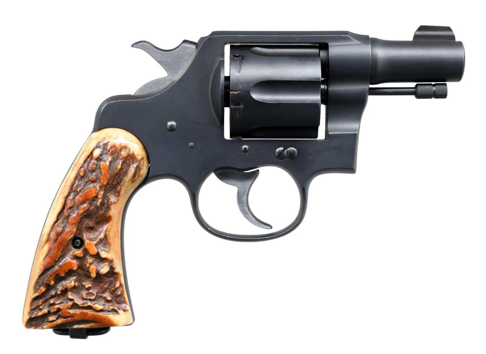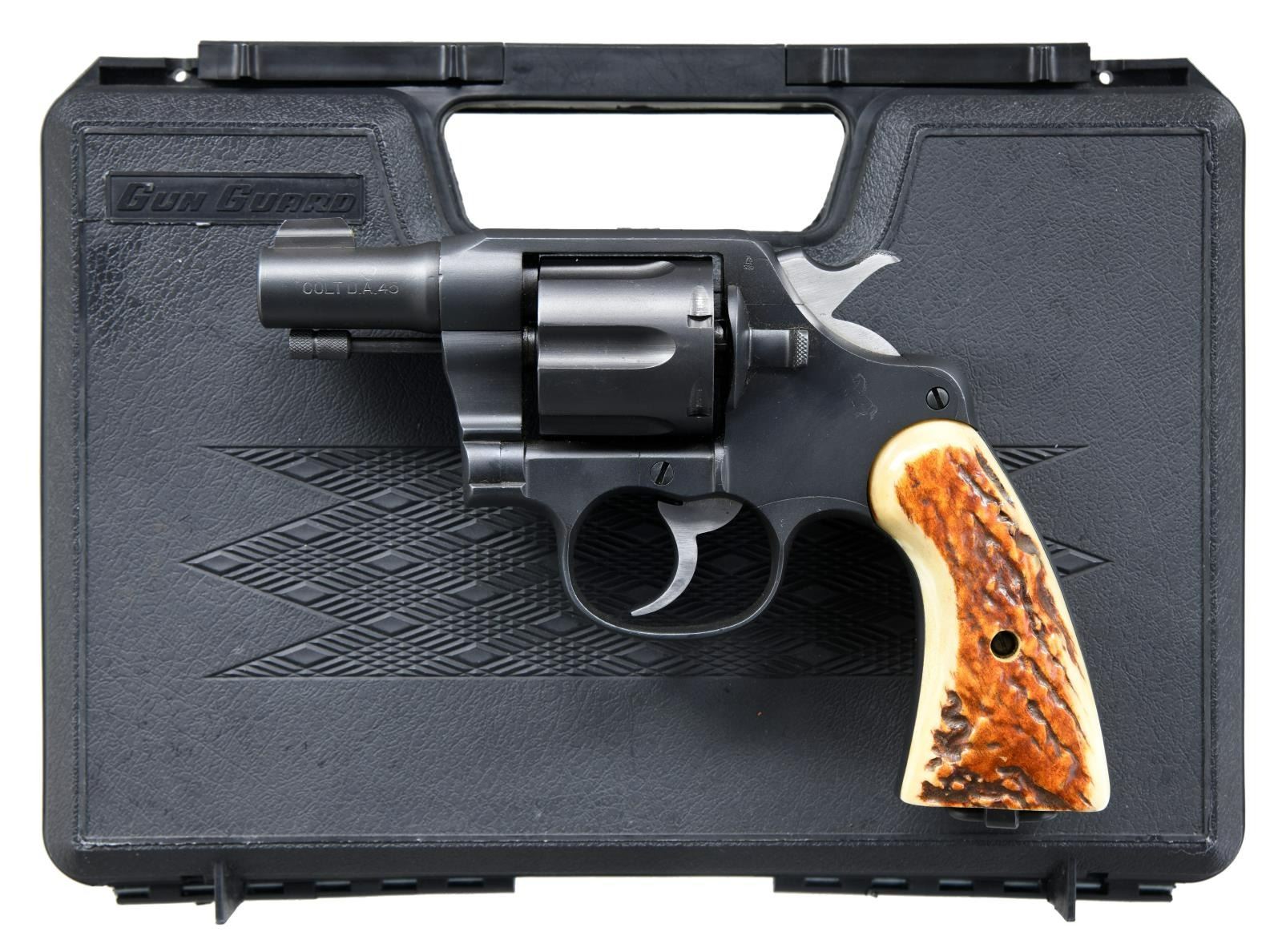 Cal. 45 ACP. S# 230744. Bbl. 2 1/2" shortened. Replacement tall blade front sight. Fixed rear sight. Bbl. has what's left of US Property marking & what appears to be a Commonwealth broad arrow stamp. Jigged bone grips that have a loose fit to frame. Lanyard ring present. UNATTACHED ACCESSORIES: Gun Guard black hard case. CONDITION: grips show light handling wear. Metal retains 95% dull reblue w/ drag line on cyl., some edge wear & scattered blued over pitting. Good bore w/ some light frosting. (23-2127/MJC). MODERN. $600-1000.