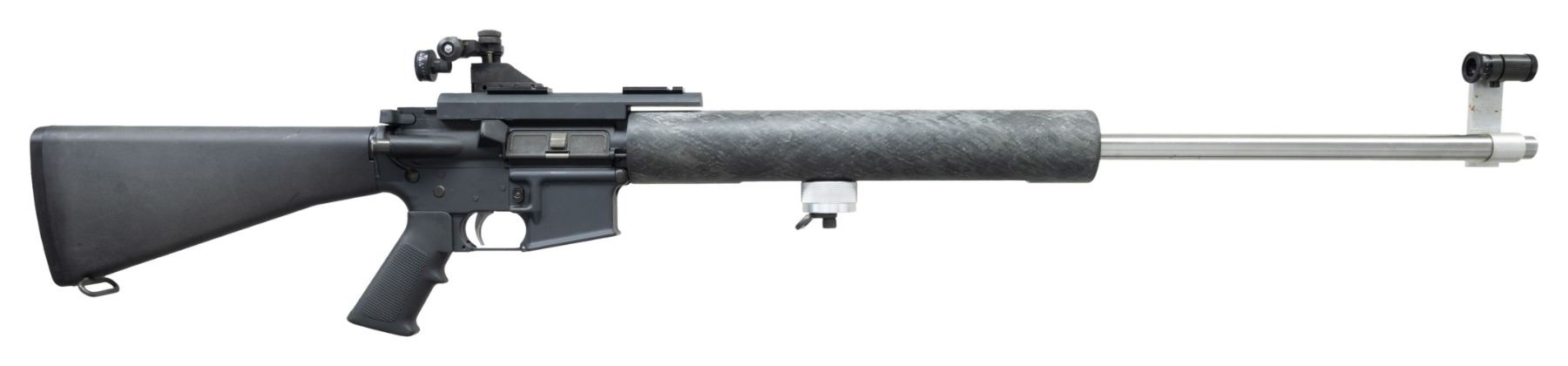 Cal. 223. S# CMH007839. Bbl. 28" unmarked heavy stainless. Diopter target front sight. RPA Trakker diopter rear sight. Upper has J.W. Wylde marked scope mount with additional Weaver style rail. Rifle appears to be a competition rifle assembled on a Colt Match Target HBAR lower. Lower has standard size push pins with double sided front pin. Upper has a darker shade of finish that lower. Match trigger.A2 style stock & pistol grip. Gray free float handguard with hand stop & swivel. MAGS: none present. CONDITION: left side of butt has former owner name & city in black marker. Furniture otherwise shows some dirt staining, handling marks & scuffing. Metal shows some light oxidation specks on bbl., some scattered light scuffs & handling marks. Action functions properly when hand cycled. Bright near excellent bore. (25-3887/MJC). MODERN. $700-1100.