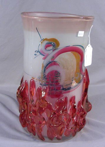 Red, pink and gray coloration with art glass in high relief. Hand signed. 17" high, 11" wide.