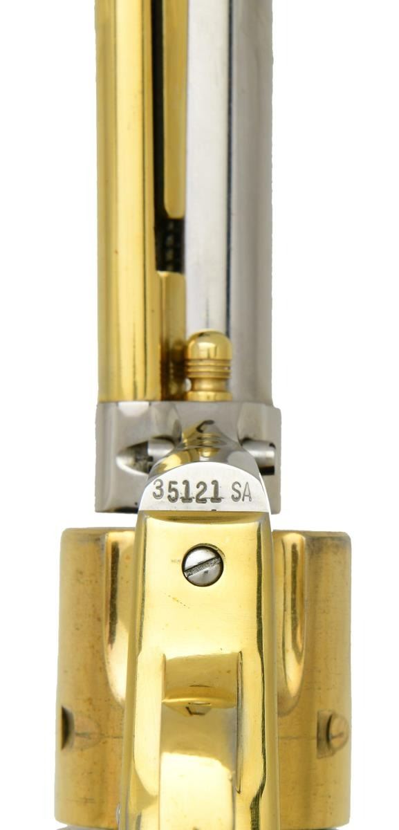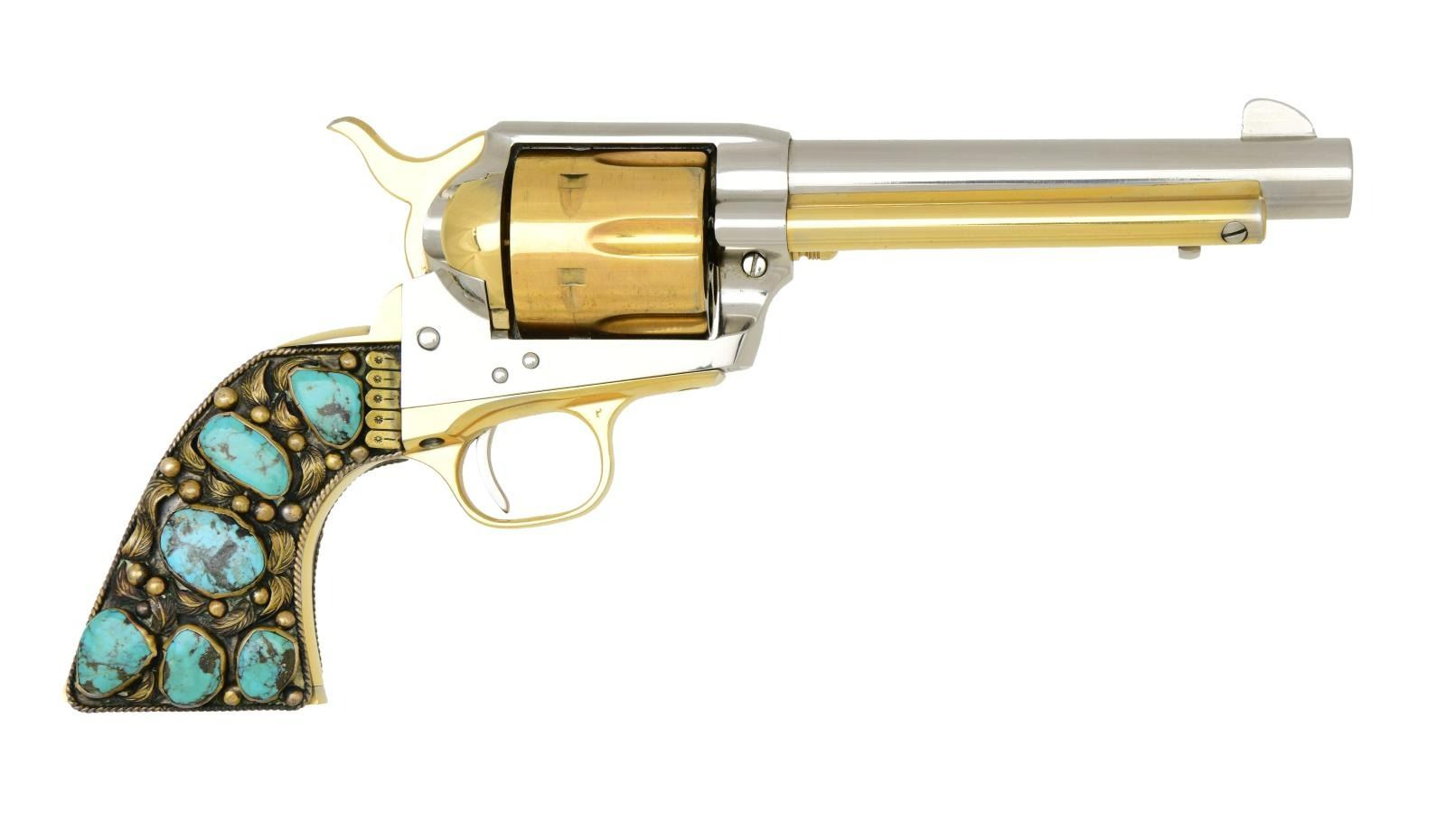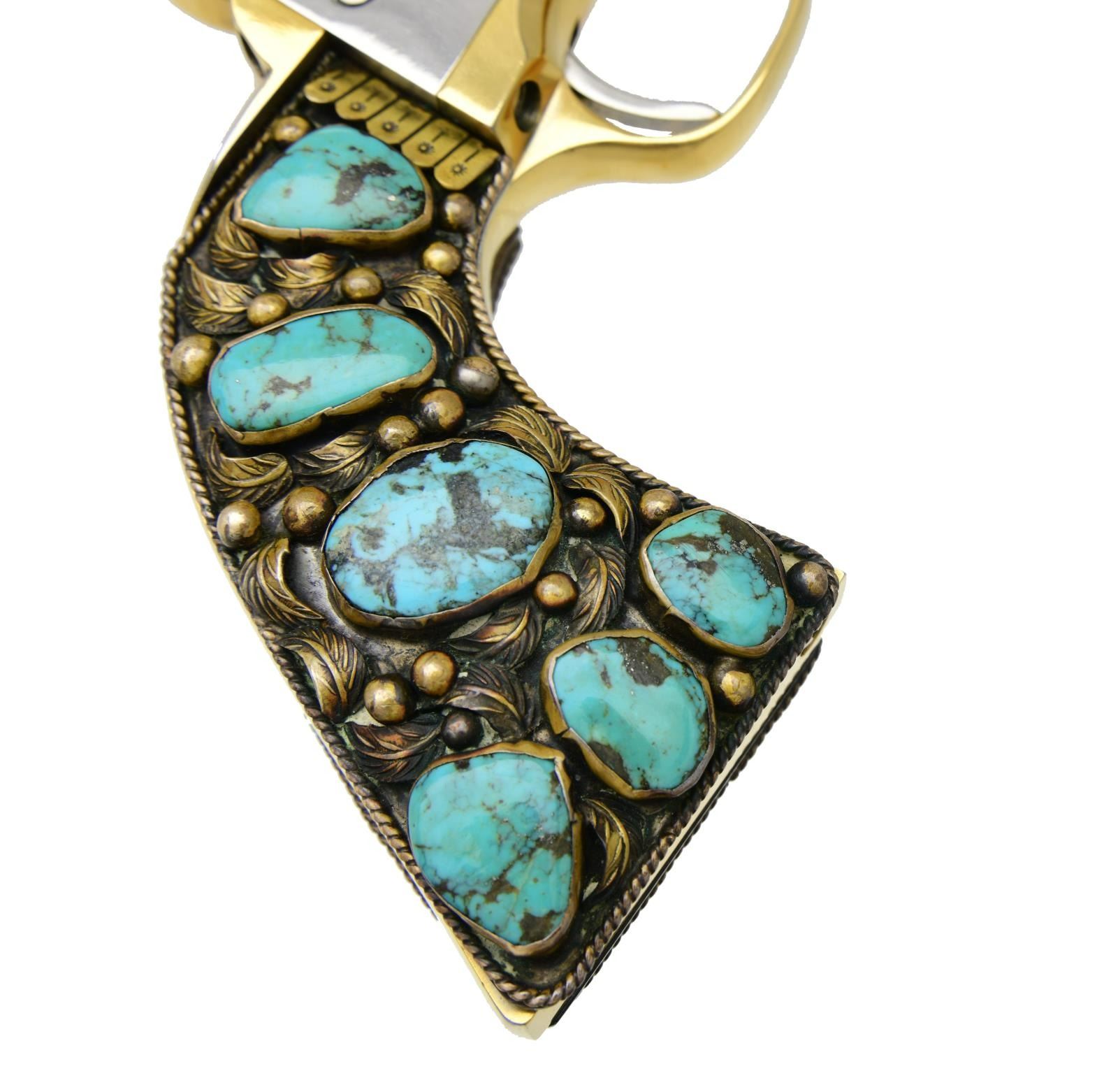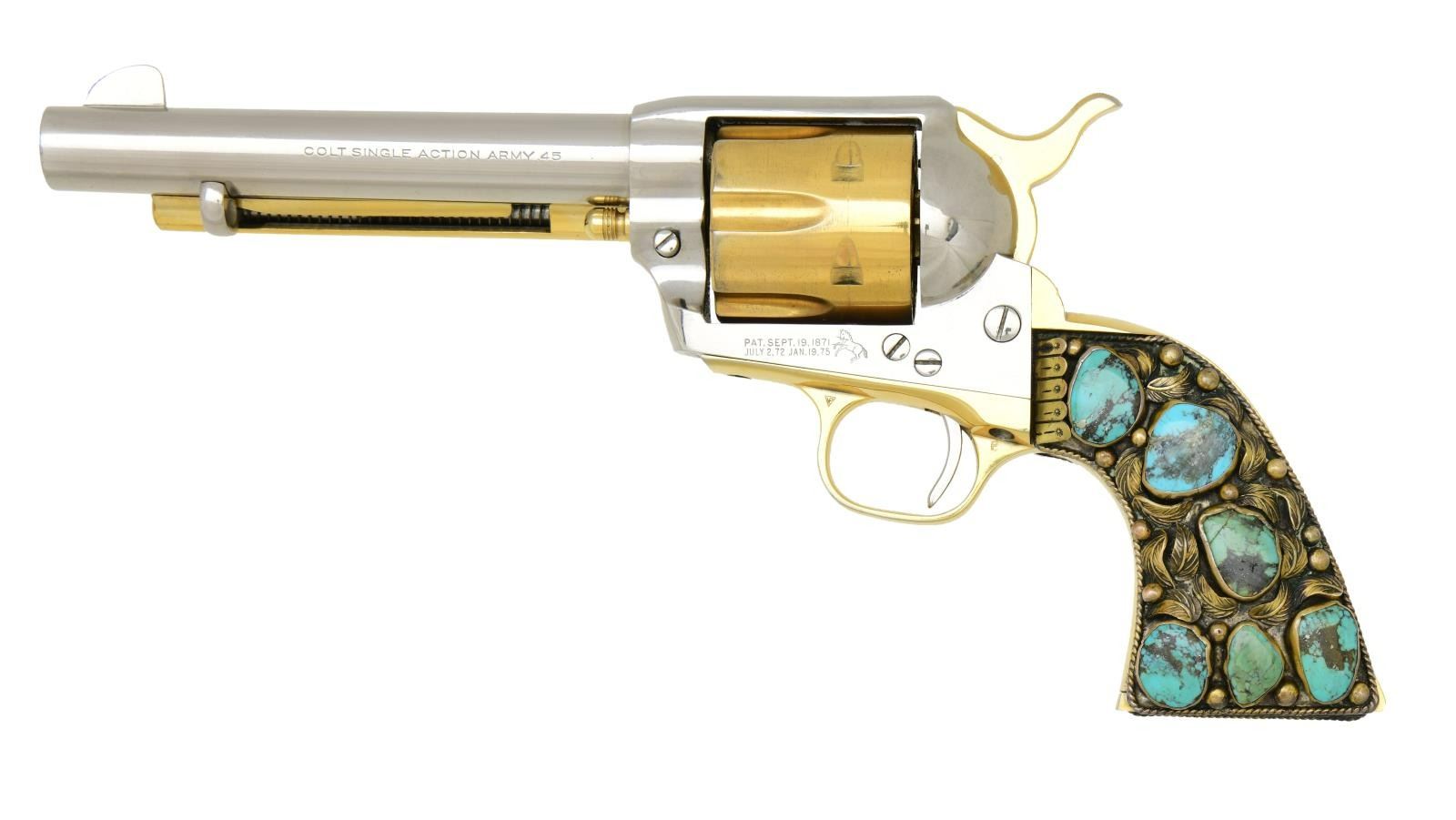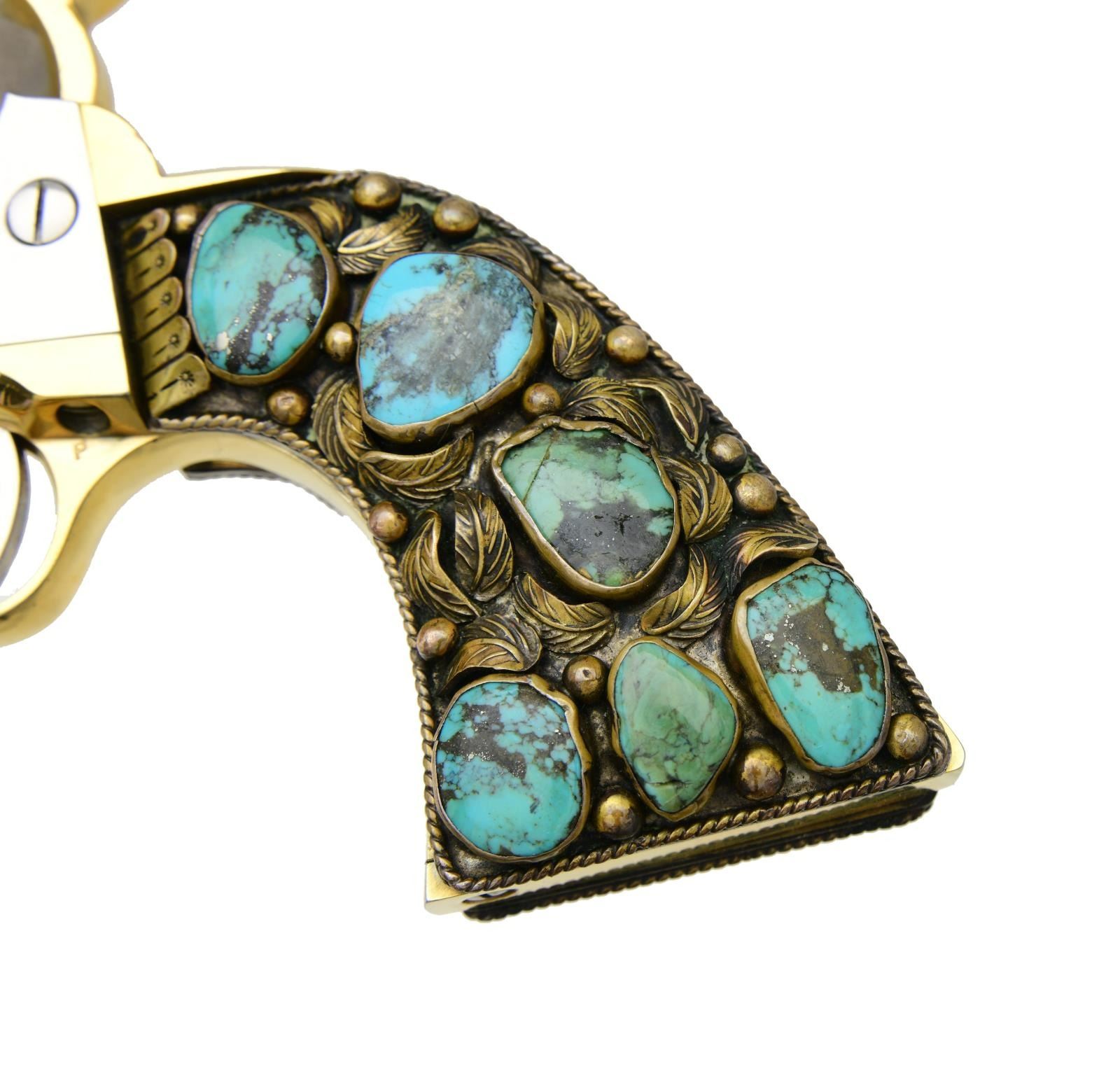 SAA REVOLVER WITH TURQUOISE INLAID GRIPS. Cal 45 Colt. S# 35121SA. Mfg. 1961. Bbl. 5 1/2" with blade front sight. 6 Shot fluted cyl. Cyl., ejector rod housing, hammer, grip frame, cyl. pin & loading gated are gold plated. Remaining metal finished in nickel. Attractive 1 piece brass grips have 6 large turquoise inlays at either side set amongst feather designs. CONDITION: fine overall. Metal finish 95% with thinning at end of ejector rod housing. Cyl. has faint drag line & the start of some light freckling. Very good grips. Bright bore with sharp rifling. (24-2124/BH) CURIO. $7,000-9,000.