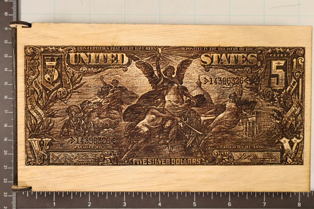 $5 BILL. 8" X 4 1/2" X 3/4" WITH FLIP TOP LID.