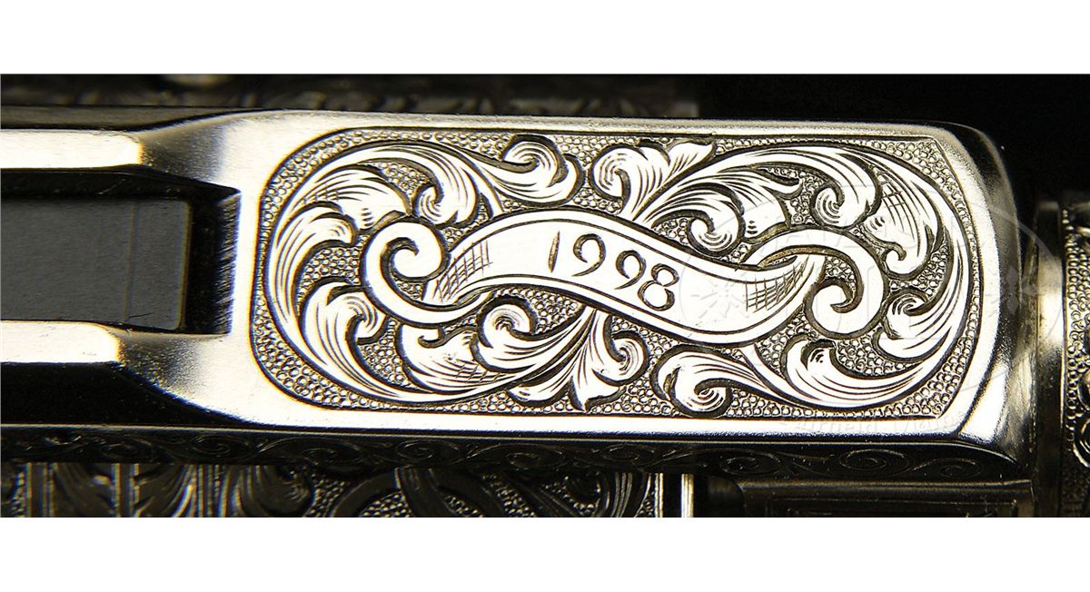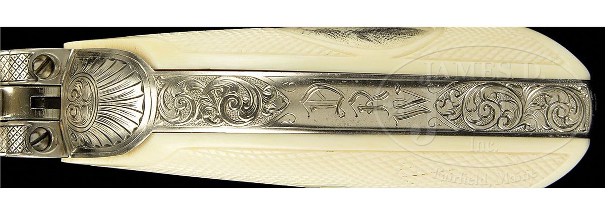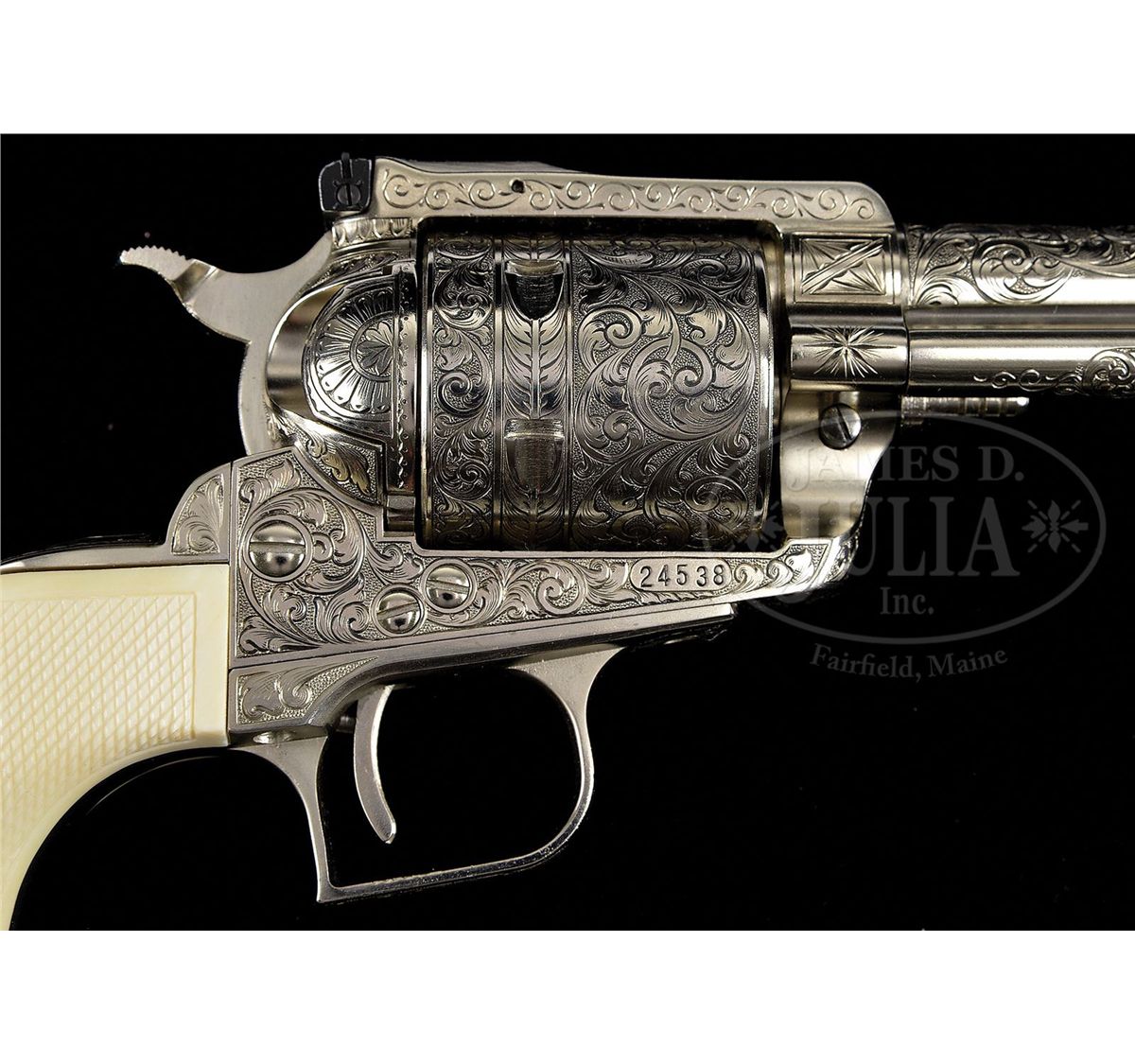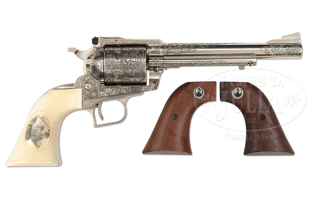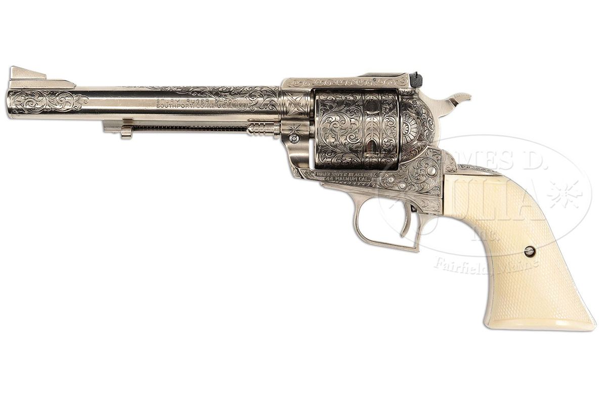 SN 24538. This Ruger Super Blackhawk 44 Magnum with 6-1/2" bbl was once in the collection of Hank Williams Jr. and has an accompanying affidavit and factory certificate from Ruger Collector's Association stating gun was from catalog number S47 with following features, ".44 Magnum Caliber, 6-1/2" barrel, steel Dragoon style grip frame, ribbed cylinder frame, super polished finish, micro rear sight, patridge ramp wide front sight, walnut grip panels, black Ruger "eagle" grip medallion, serial number size: 1/8", action type: "Old Model" single action. The 6-1/2" barrel S47 was produced during 1966 only." Gun has since been fully engraved and had checkered ivory grips with "bear" vignette on right side added. The orig wood grips accompany the pistol also. PROVENANCE: Hank Williams, Jr. Collection. CONDITION: The gun is in very fine to excellent condition overall retaining most of its orig finish with engraved initials on backstrap of "DRW". The date "1998" is engraved on a scroll on frame flat. The "ivory" colored grips were not removed to see what material they are made of but appear to be elephant ivory but fit loosely. Action is crisp and bore is shiny and well defined. 4-49363