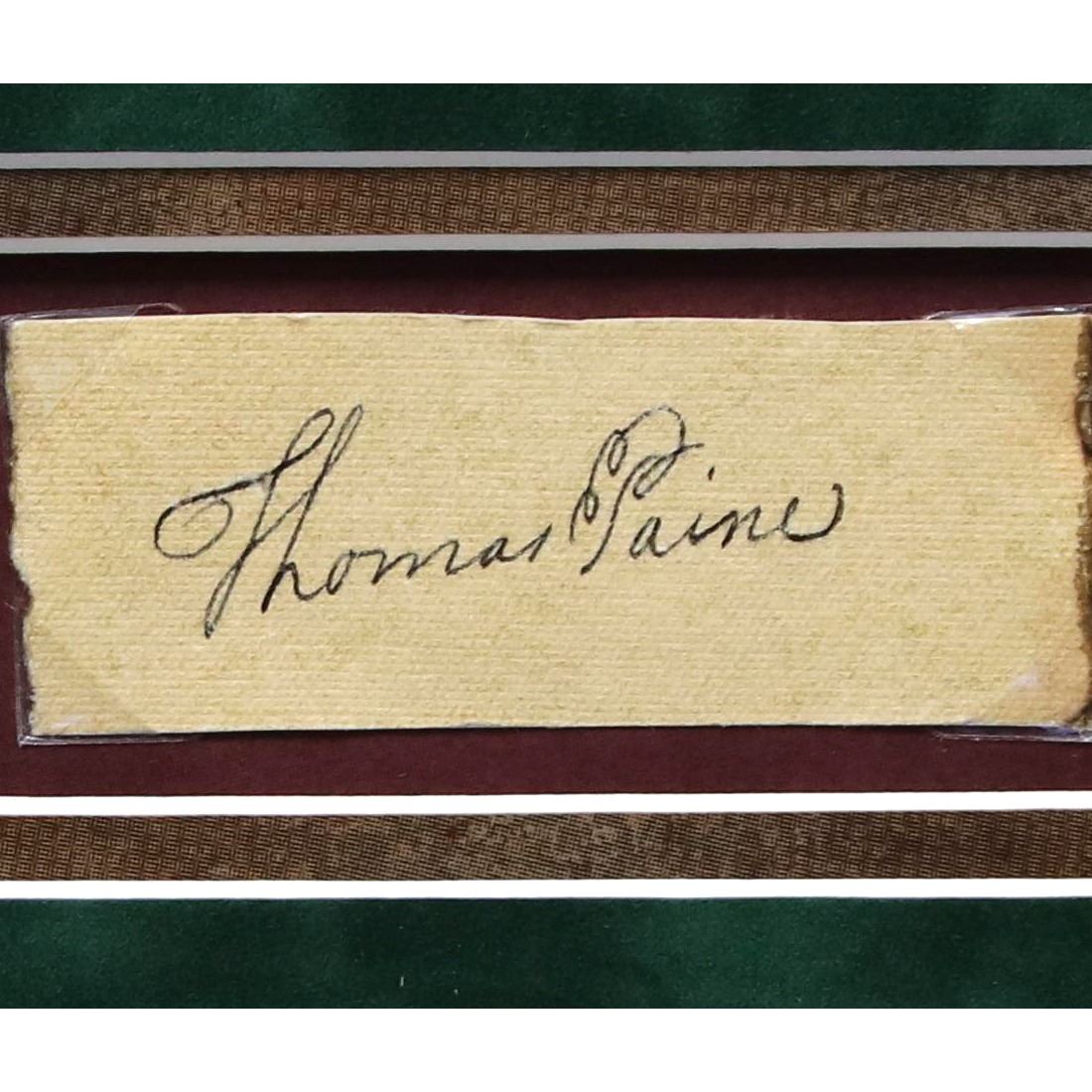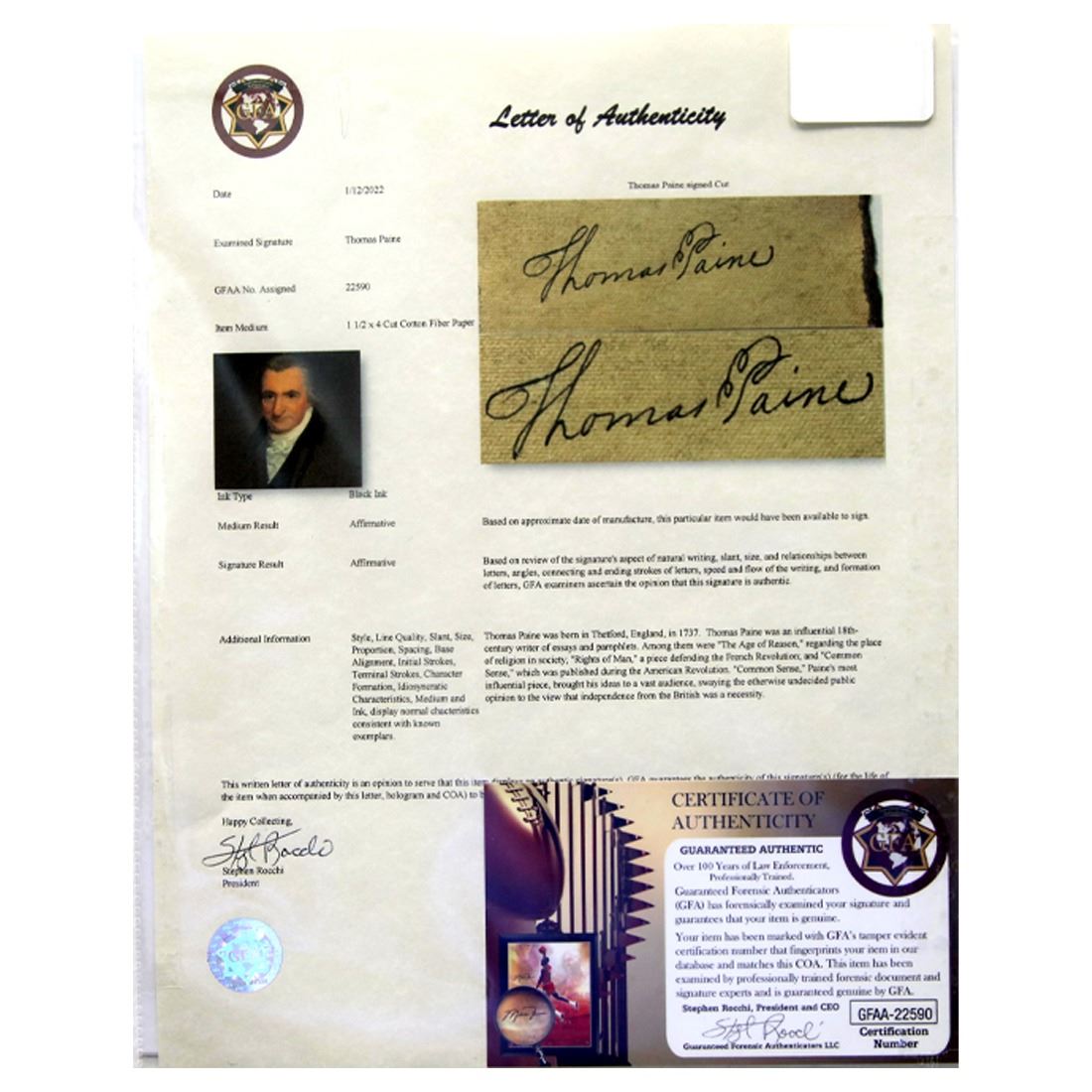 Thomas Paine (February 9, 1737–June 8, 1809) signed 1.5 X 4.5cut paper. Thomas Paine signed in black ink. Thomas Paine was an influential 18th-centurywriter of essays and pamphlets. Among them were "The Age of Reason,” regarding the place of religion in society; "Rights of Man," a piece defending the French Revolution; and "Common Sense," which was published during the American Revolution. "Common Sense," Paine's most influential piece, brought his ideas to a vast audience, swaying the otherwise undecided public opinion to the view that independence from the British was a necessity. His writings influenced the American Revolution and helped pave the way for the Declaration of Independence. Professionally custom matted and framed. Comes with a Letter of Authentication from Guaranteed Forensic Authenticators (GFA), along with the GFA guarantee of authenticity.