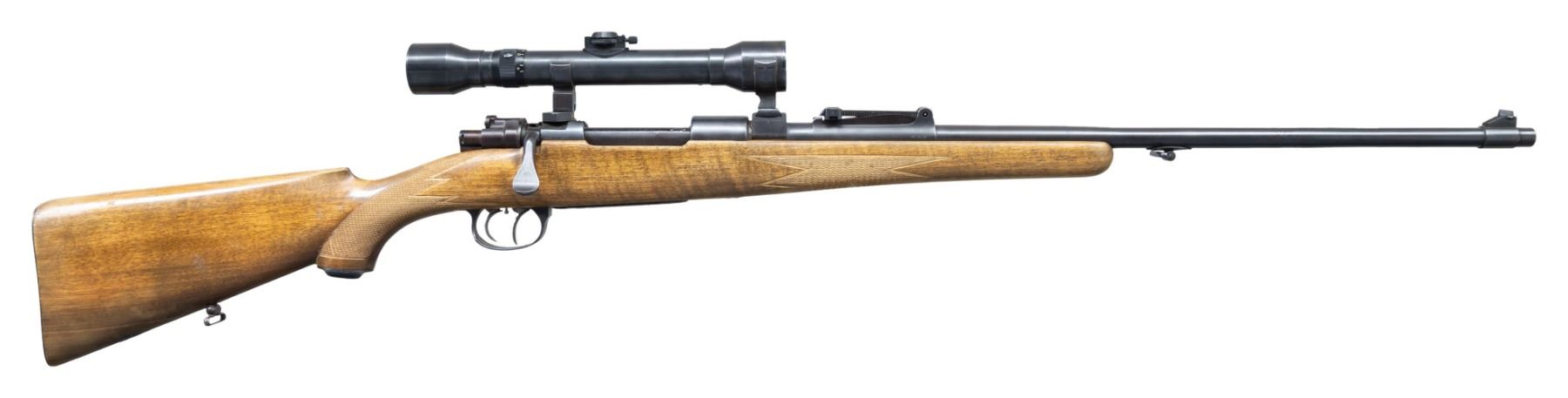 Cal. 8x57 (8mm Mauser). S# 9491r (2nd "9" partially worn). Custom rifle built from World War II German K98K barreled action. Bbl. 24" w/ 3 eagle 359 proofs on right side & sling swivel added to bottom of barrel. Standard 98K sights. Hensoldt-Wetzlar Dialytan 4x, post reticle scope on claw mounts (S# 7770). Model 98K action w/ replacement butterknife bolt handle. Dbl. set triggers. Floorplate assembly has floral & acanthus scroll engraving highlighting a bugling elk on floorplate & antelope buck on triggerguard bow. Custom checkered walnut stock with "WBD" engraved toeplate, steel grip cap, & steel buttplate. CONDITION: very good reblued metal finish. Very good stock finish with numerous light dings & marks. Good bore with frosting & wear to rifling. Very good scope finish with light cloudiness to optics, but serviceable. (25-2139/MD). MODERN. $1,200-1,800.