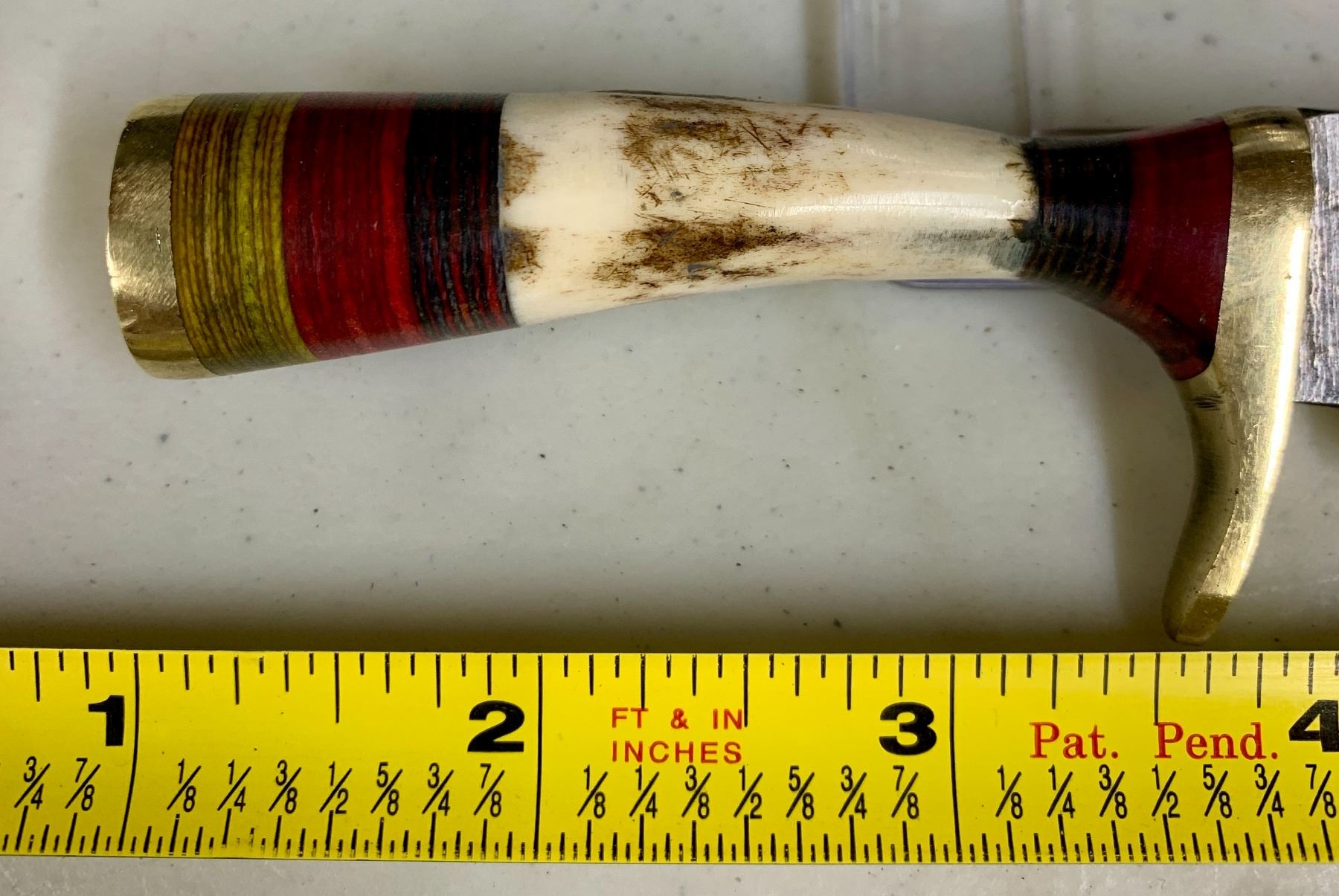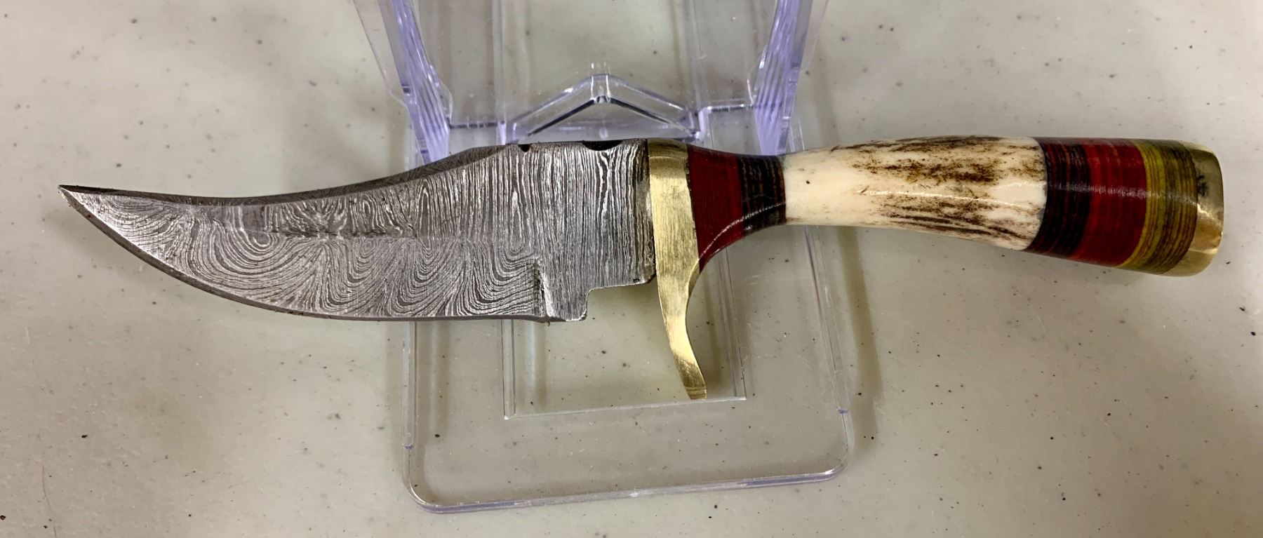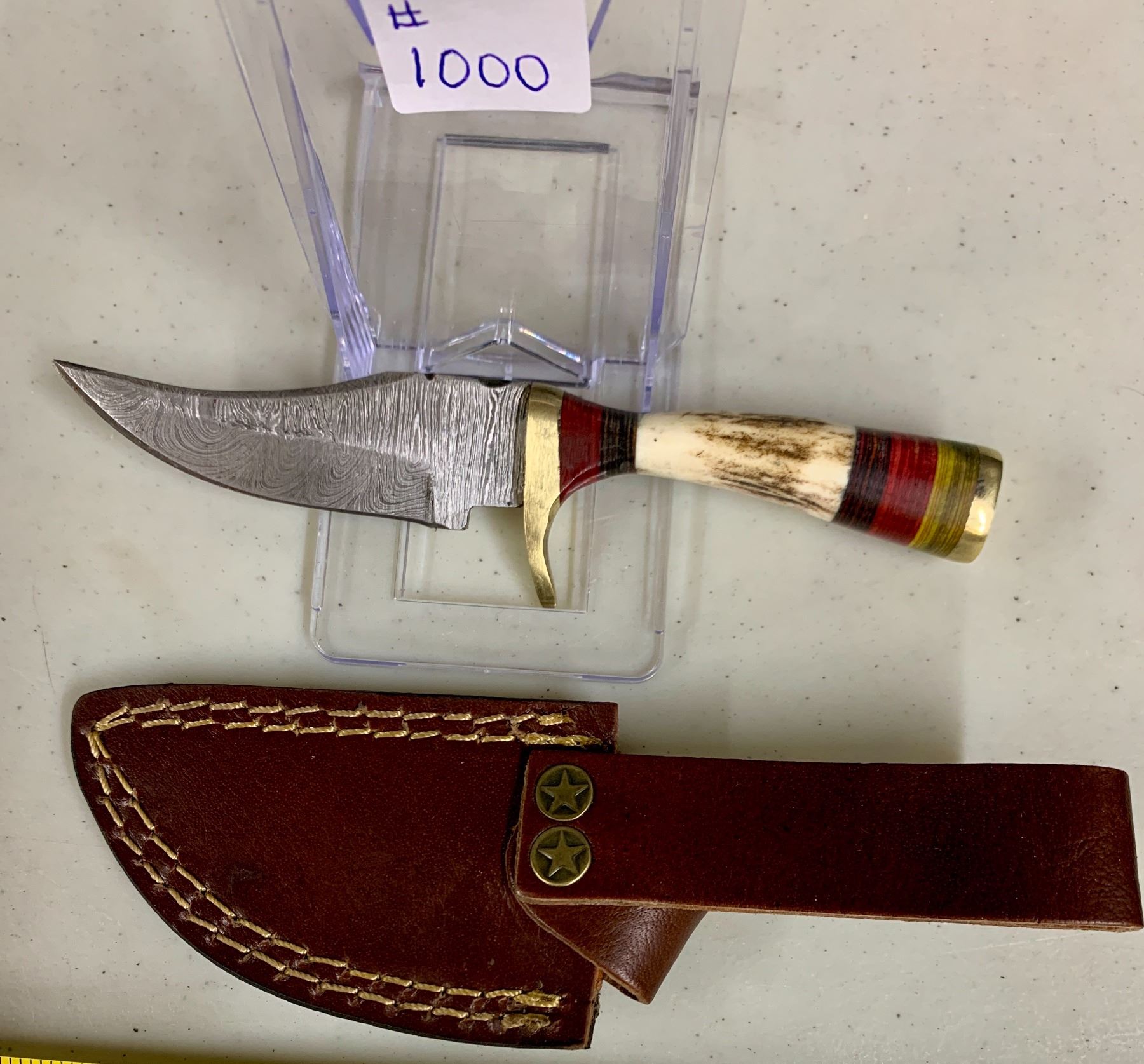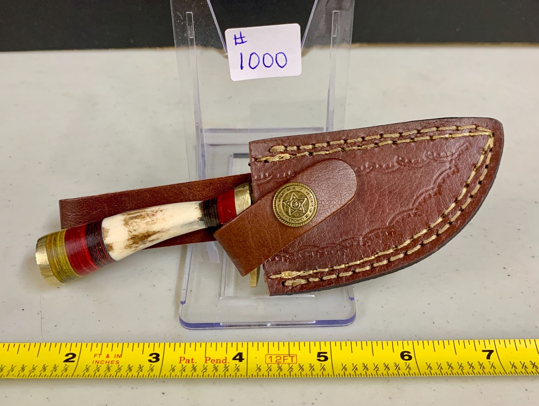 CUSTOM HANDMADE DAMASCUS STEEL ANTLER HANDLE SKINNING KNIFE + LEATHER SHEATH / NEW