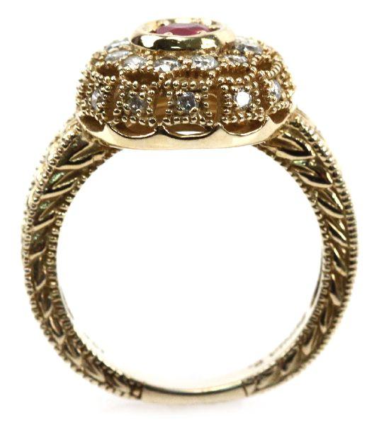 Custom Sonia B. design 14K ring with an approx. 0.2ct round cut ruby surrounded by (12) approx. 0.03ct round full cut diamonds and (12) approx. 0.01ct round full cut diamonds. Size: 6 Weight: 6.3 g Condition: Very good