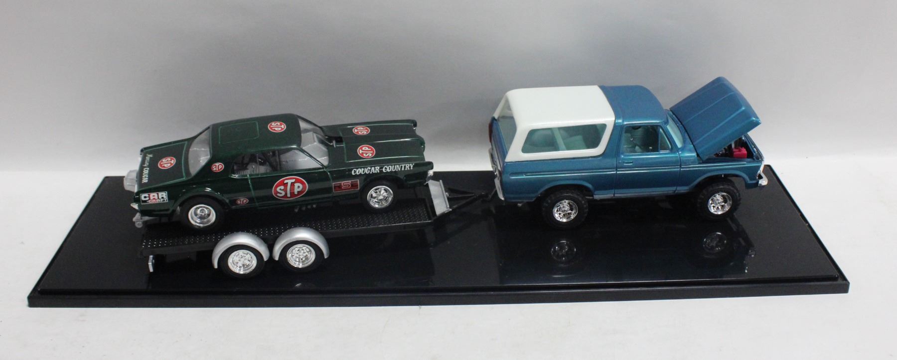 TRUCK WITH FLAT DECK TRAILER HAULING 1967 MERCURY COUGAR MODEL CAR IN DISPLAY CASE