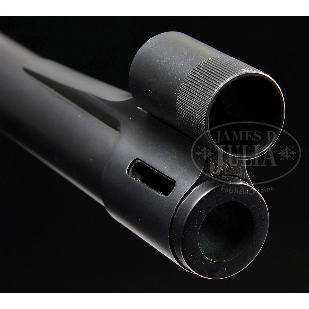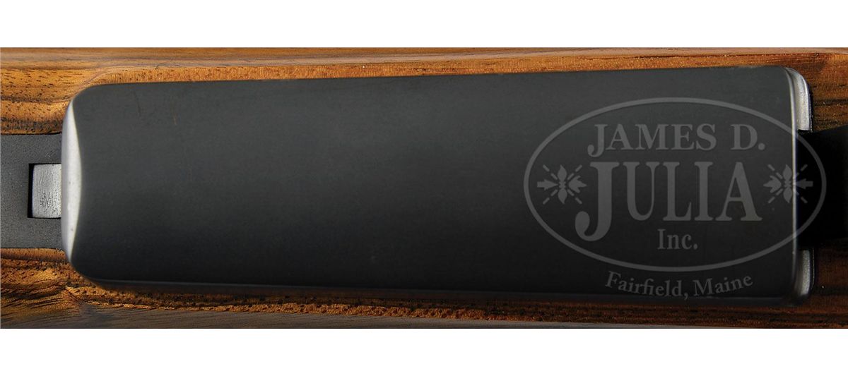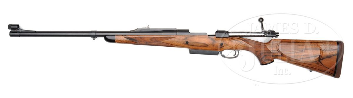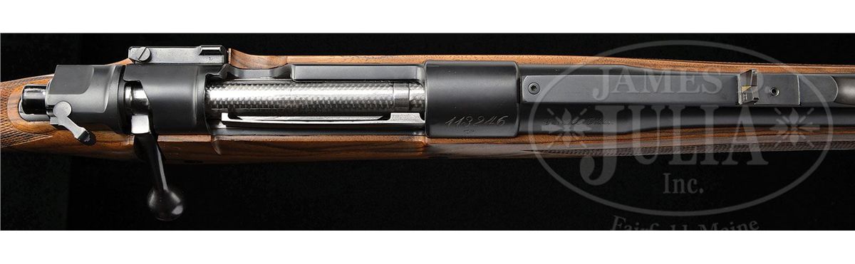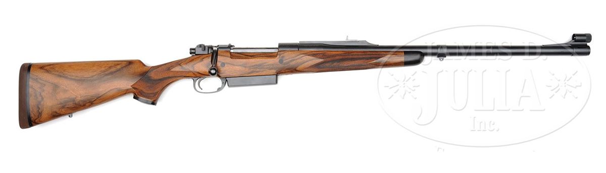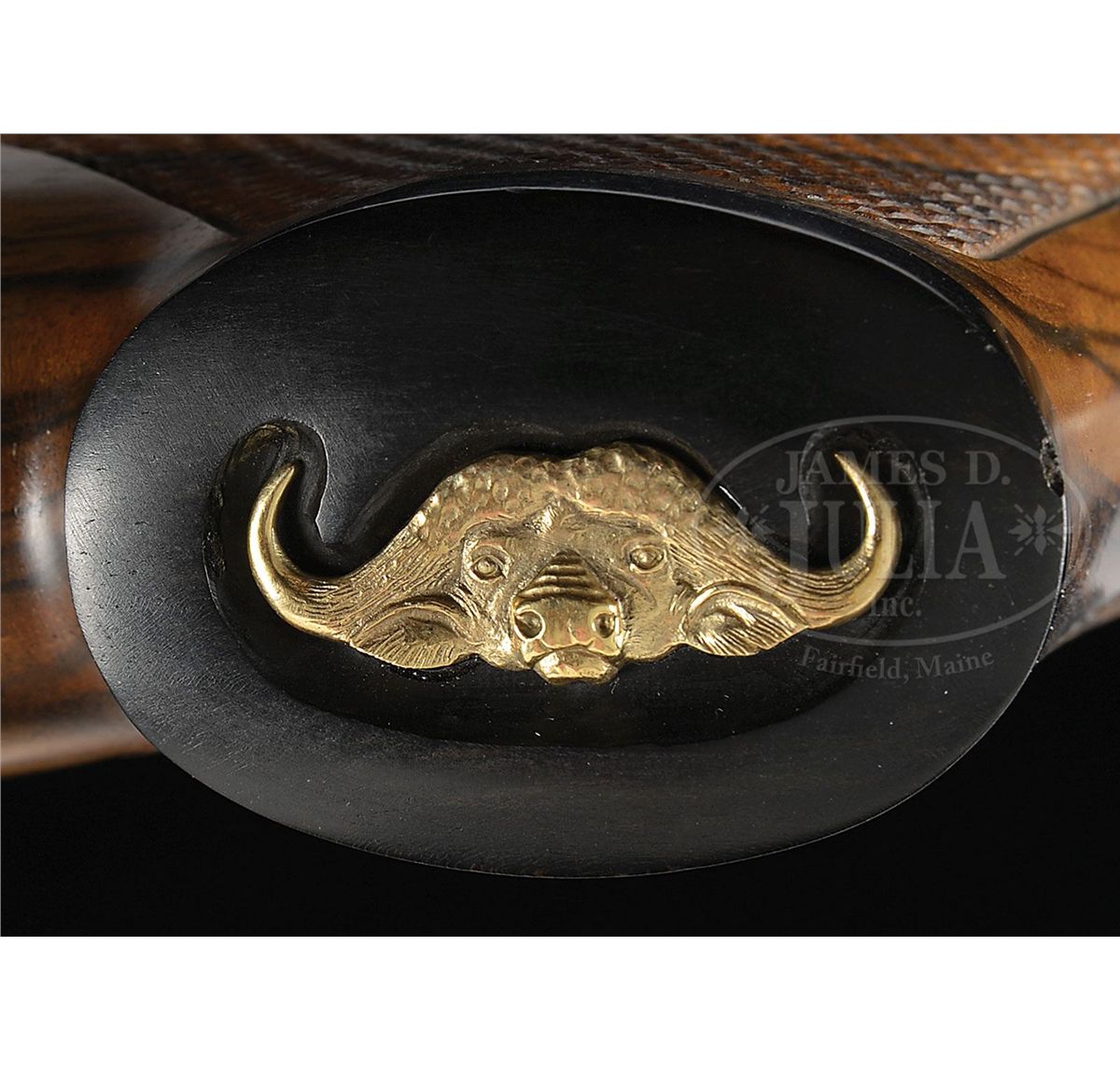 SN 113246. Cal. .505 Gibbs. 24" Heavy sporter bbl is fitted with quarter rib holding single standing leaf express rear sight marked for 50 yards, banded-on sling eye, banded-on hooded front ramp with ivory bead front sight, and extra recoil lug brazed to bottom. Bbl has been ported. Caliber is engraved on right rear. Magnum length Mauser action has been fitted with Timney trigger. SN is engraved on right side of receiver ring over an old London view proof. Bolt with jeweled body, has had long pear shaped handle added, and is fitted with new shroud with Model 70 type safety. Blackburn type bottom metal has been fitted with large, square, hinged box floorplate, and is retained by typical release button in trigger guard bow. Dark veined, flesh-toned, slab sawn European walnut pistol grip stock measures 14-5/8" over brown Decelerator pad and features classic shadow line right hand cheekpiece, ebony forend tip, two reinforcing pins to stock, sling eye, ebony grip cap with inlet solid gold face-on portrait of cape buffalo, as well as point pattern checkering at grip and forend. Drop at heel: approx 2-1/8", drop at comb: approx 1-3/4". Weight: 9 lbs. 14 oz. LOP: 14-5/8". CONDITION: Excellent. Metal retains nearly all of its custom finish with some light scratches, mostly on trigger guard bow. Stock has a number of light and heavy marks, and one long scratch on right side of butt in its orig rubbed oil finish. Bore is excellent. Action is smooth. 4-49350 MGM240