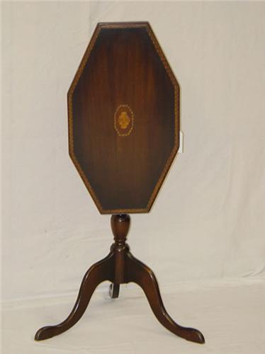 CUSTOM MAHOGANY OCTAGONAL TIP TOP CANDLESTAND W/ BEADED EDGE, FLORAL & CHECKERED INLAY, TURNED SHAFT, & CABRIOLE LEGS - WEAR & IMPERFECTIONS
