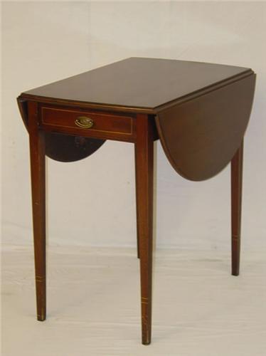 CUSTOM MAHOGANY PEMBROKE DROPLEAF TABLE W/ LONG DRAWER, OVAL BRASS, & TAPERED LEGS-HATHAWAY'S, NEW YORK CELLULOID TAG - WEAR & IMPERFECTIONS