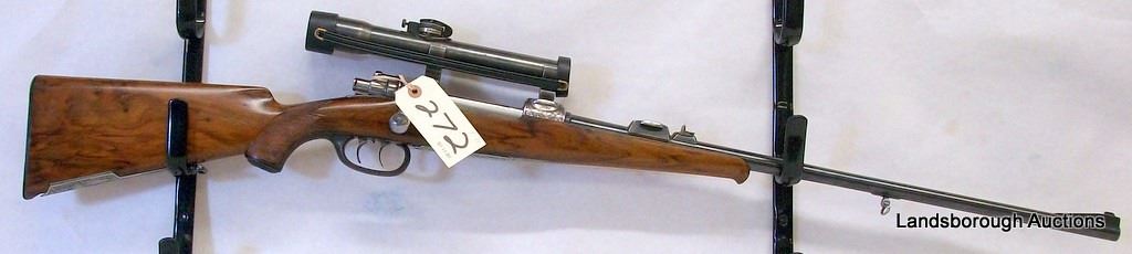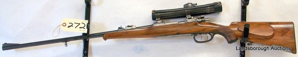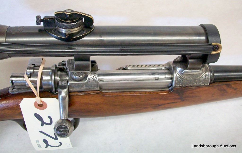 NON-RESTRICTED, BOLT ACTION, 9.3 X 57, 24" BARREL, SN 1013. VERY GOOD OVERALL CONDITION. MAUSER SCOPE AND DOUBLE SET TRIGGER GROUP.