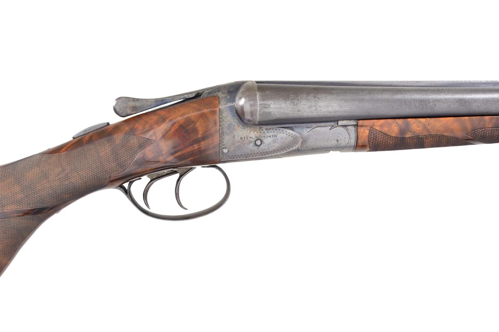 SHOTGUN. Cal. 20 Ga., 2 3/4". S# 261661. The 28" bbls. with slightly raised matted rib are marked with Sterlingworth steel info and Fox Philadelphia address on tops. Bbl. flats are stamped with serial number and Fox proof. Case hardened small size fox action features nonautomatic safety and double triggers action is engraved in usual Sterlingworth style with wiggle borders and “STERLINGWORTH” on sides. Serial number is on triggerguard tang. Custom long and deep round knob buttstock of very fine piece of crotch figured American walnut measures 14 3/4" over “Old English” sporting clays black pad. Ribbons run through fancy checkering pattern at grip. Matching splinter forend has spring tension release. MEASUREMENTS: BBLS: Bore Diameter: R .618", L .618". Restriction: R .004"(IC), L .005" (IC). Min. Wall Thickness: R .028", L .030". STOCK: DAH: 1 7/16". DAC: 1 1/2". LOP: 14 3/4". CAST: neutral. WEIGHT: 6 lb. 11 oz. CONDITION: good as partially refurbished. Barrels retaining most of their original blue with thinning on sides and overall light freckling. Action retains about 1/2 of its original case hardening color, thinning and turning silver gray on bottom and on fences. Custom stocks retain nearly all of their hand rubbed oil finish, checkering with very little wear. Bores are bright and shiny. Forcing cones have been lengthened. Mechanically good. (22-2200/MGM). CURIO. $700-1,000.