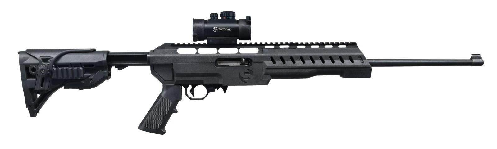 Cal. .22 LR. S# 127-84118. Bbl 18 1/2". 10/22 manufactured by Ruger in 1982. Aftermarket black polymer chassis featuring a 14 1/4" upper picattiny rail that is mounted with a CenterPoint Tactical Model 72601 1x40mm reflex sight and FAB Defense adjustable buttstock. Receiver is installed w/ a Volquartsen Slide Fire trigger pack. CONDITION: bolt and barrel exhibit mild wear, with scattered spots of mild surface oxidation. Very bright bore with strong rifling throughout. Polymer furniture is very good overall, with some mild marring to the screws. Reflex sight shows some minor wear and retains a clean sight picture. (23-1380/MLW). MODERN. $300-500
