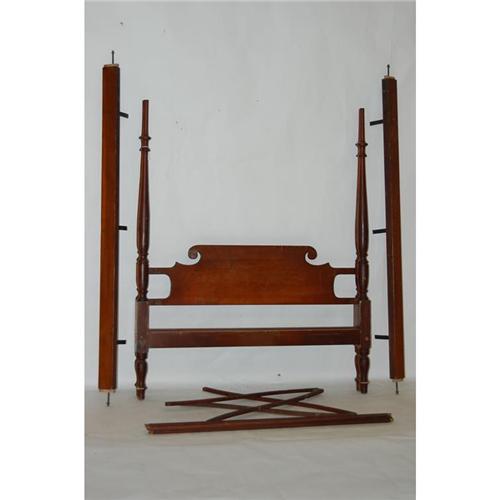 CUSTOM SHERATON STYLE CANOPY BED - 20TH CENT. PINE BED W/ SHAPED HEADBOARD, TURNED POSTS & ARCHED CANOPY TOP IN A DARK NATURAL FINISH (APPROX. 74" T X 57 1/2" W X 80 1/2" L) - WEAR, REPAIRS, IMPERFECTIONS