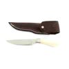 (1) STEEL BLADE, MARKED: "STEVENSON", IVORY HANDLE, BROWN LEATHER SHEATH, BLADE APPROX. 4". SEE PHOTOS.