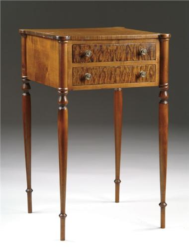CUSTOM TWO DRAWER SHERATON STYLE STAND. Figured maple top with round shaped corners supported by tall turned delicate legs. Two figured wood drawers each with two decorative brass knobs. SIZE: 27in. h x 16-1/2in. w x 16-1/2in. d. CONDITION: Very good. 9-26056