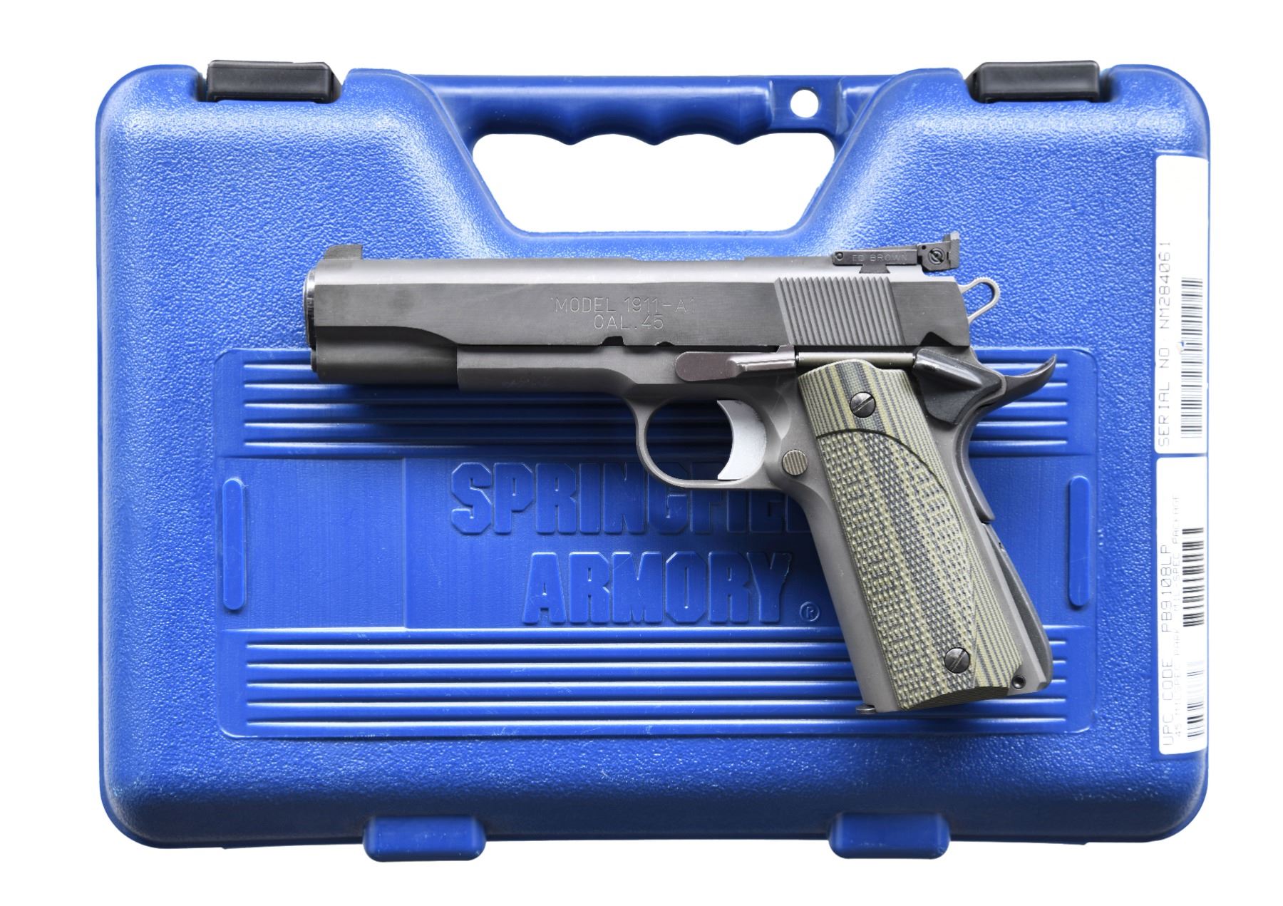 A1 MILSPEC SEMI AUTO PISTOL. Cal. 45 ACP. S# NM284061. Mil Spec Springfield Armory Inc. 1911 pistol with a multitude of aftermarket upgrades including 5" Kart National Match barrel, Ed Brown adjustable rear sight, C&S medium length trigger, C&S forged extended slide stop, C&S ring hammer, S&A extended beavertail grip safety, VZ checkered grips,.158" hammer pin, 18# hammer spring and much more. Pistol has a custom parkerized finish. Included invoices indicate the work done to this pistol in November 2013 totaled $806.98. MAGS: 2-7 rd. UNATTACHED ACCESSORIES: matching numbered factory hard case with manual, paperwork, set of black checkered Springfield grips, holster, dual mag pouch, key for internal locking system, original trigger, slide stop & two dot rear sight. Invoice from Angus Arms Co. detailing upgrades. CONDITION: grips show light handling wear. Metal retains 92% parkerized finish with a slide stop reassembly scratch on left side of frame, scattered edge & handling wear. Action functions properly when hand cycled. Bright near excellent bore. (24-6615/BH). MODERN. $1,000-1,500.