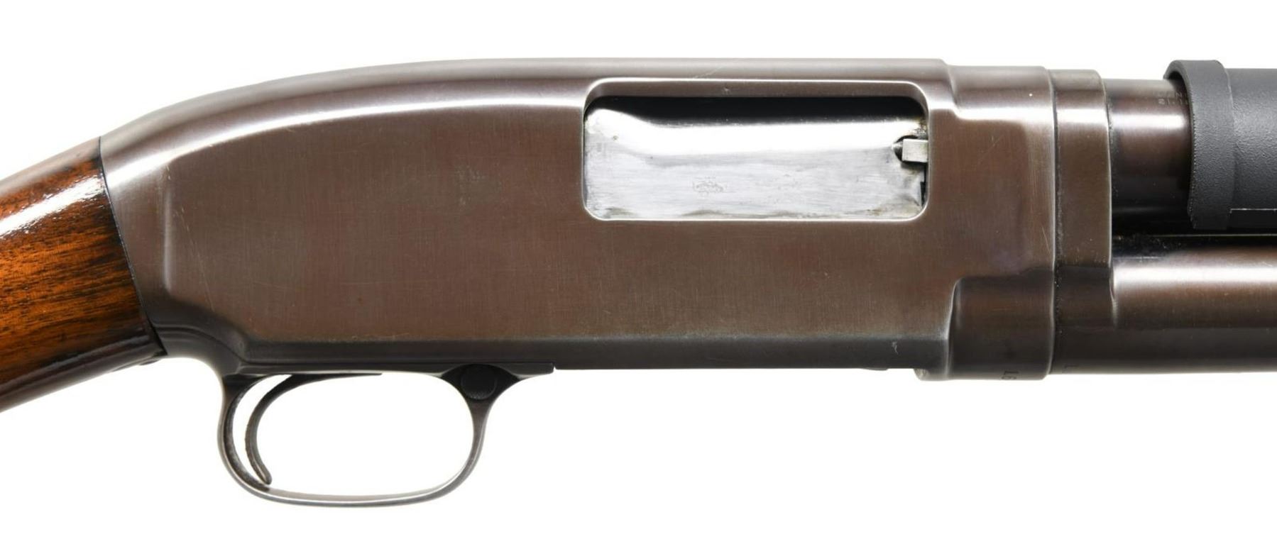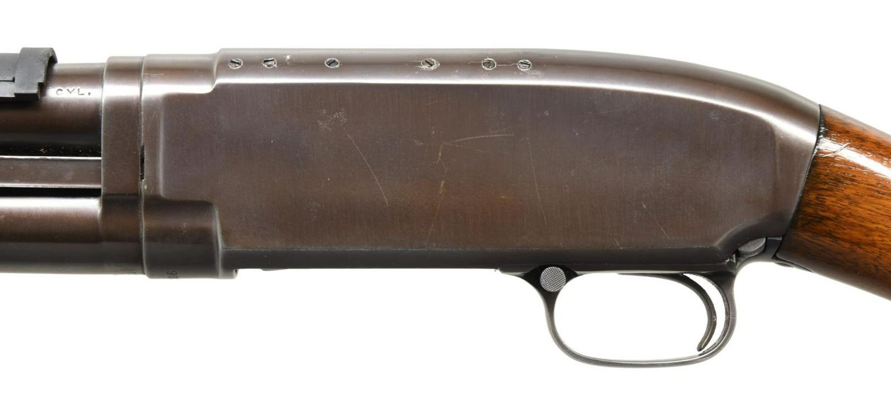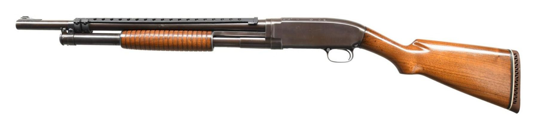 Cal. 12 GA. S# 166206. Bbl. 20 1/2". Model 12 pump action shotgun mfg. by Winchester in 1918. Left side of bbl. is stamped with usual factory markings. Metal components exhibit a reapplied blue finish overall. Plain wood buttstock and grooved forend have been lightly sanded and revarnished. Left side of receiver has been drilled and tapped with 6 holes. Bbl. has been cut down and mounted with a ramped aluminum beaded blade front sight, and is fitted with a black polymer heat shield. Buttstock has been fitted with a Pachmayr White Line red rubber recoil pad. CONDITION: metal components retain the majority of their reapplied blue finish, exhibiting some areas of wear and thinning, with pitting present beneath the finish overall. Bright bore, exhibiting areas of mild to moderate pitting throughout. Wood furniture shows some scattered marks from handling and storage, but otherwise remains sturdy and serviceable. (23-5378/MLW). MODERN. $300-400.