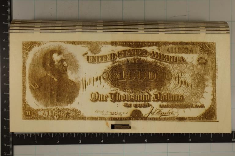 ON THE LID. BOX IS 9" X 5'' X 1.25" TALL. HAS A SLIDE LATCH AND WILL HOLD LARGE SIZE CURRENCY FLIPS OR OTHER ITEMS YOU WANT TO STORE. MADE FROM HARDWOOD AND IS BRANDNEW