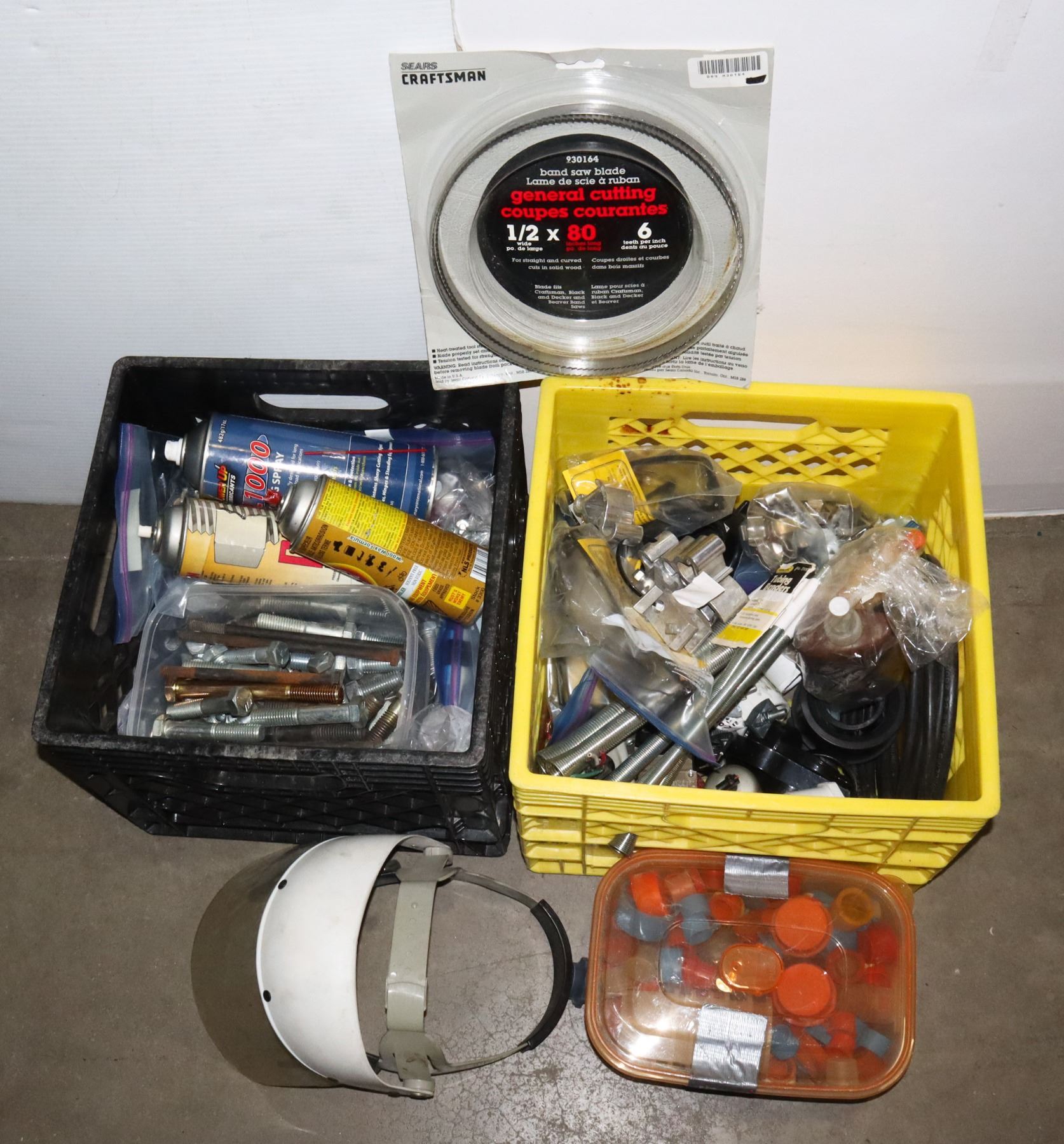 OF ASSORTED SHOP SUPPLIES AND MORE. INCLUDES NEW 1/2" X 80" CRAFTSMAN BAND SAW BLADE, USED FACE SHIELD, AND MORE