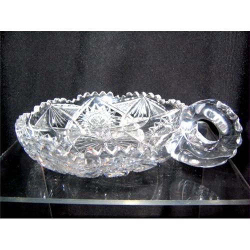 BEUTIFUL LITTLE CANDY DISH. THE CRYSTAL IS HEAVY WITH DEEP CUTS,IN A THE BRILLINT CUT DESIGN,HAS A STAR PATTERN.THE HANDLE IS SO CHARMING AT FIRST I THOUGHT IT WAS A CANDLE HOLDER.THIS IS UNUSAL,GREAT BUY.