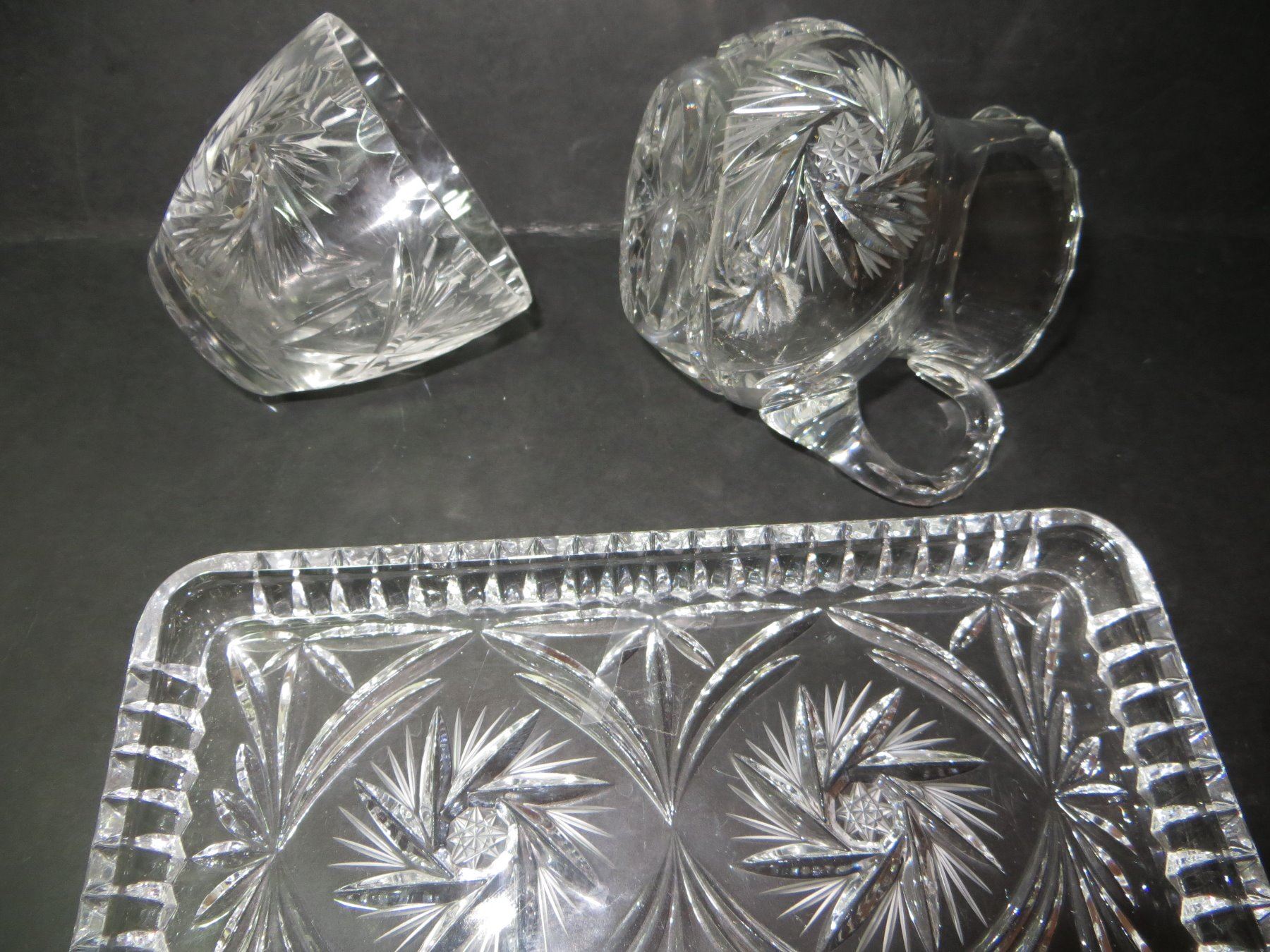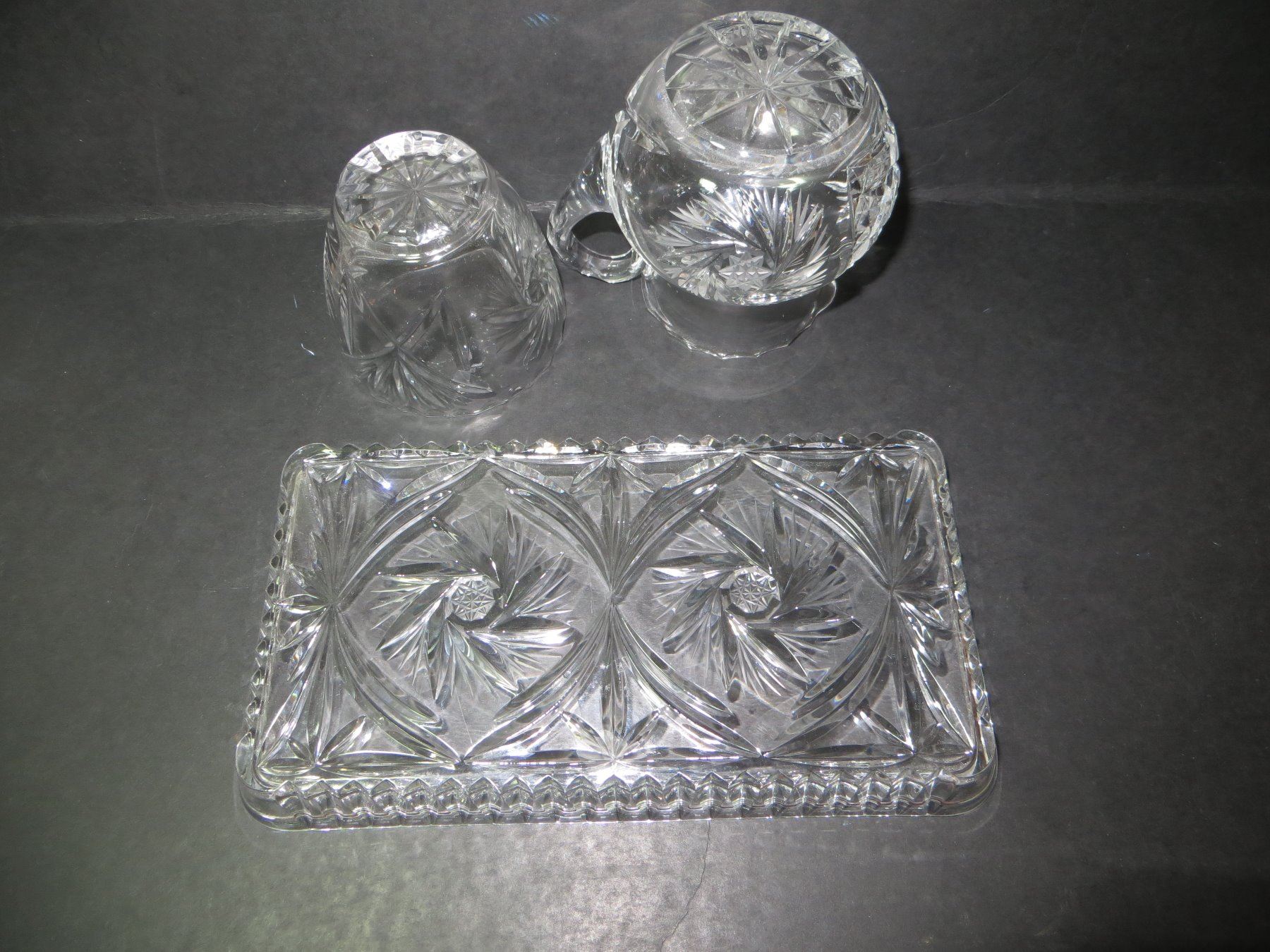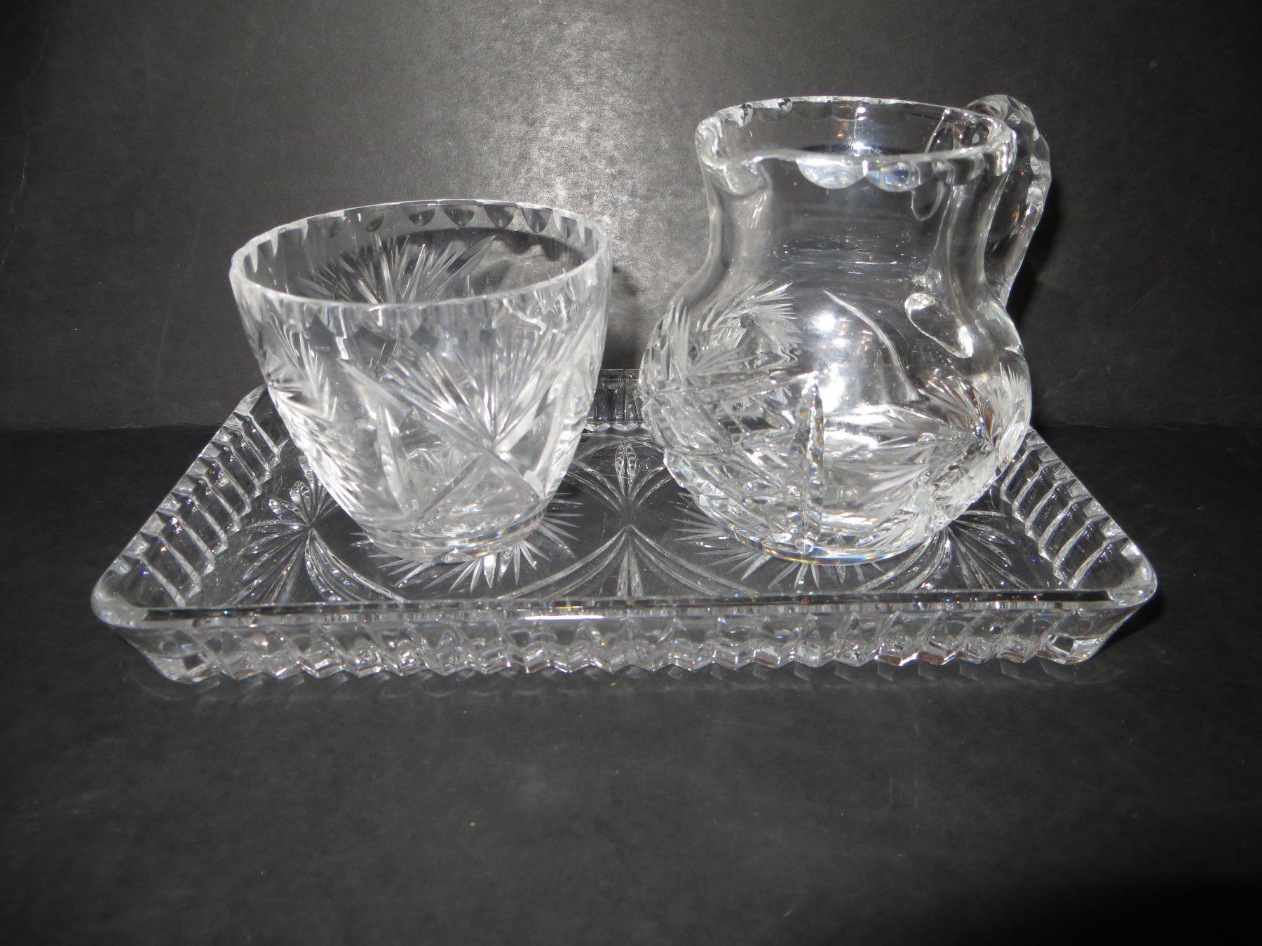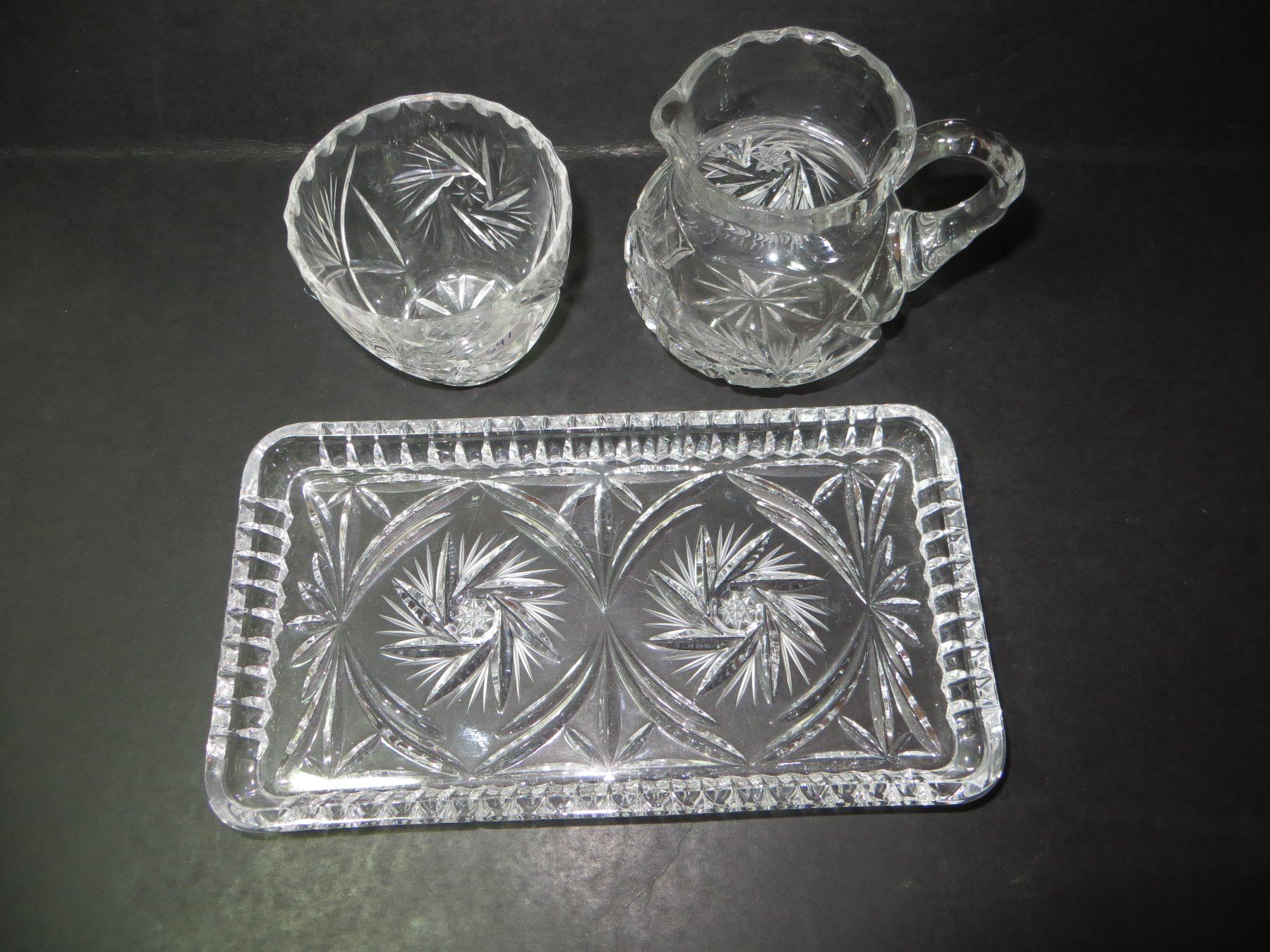 CUT CRYSTAL CREAM AND SUGAR SET (SPINNING STAR OF DAVID DESIGN) *TRAY 8" LONG X 4 1/4 WIDE, CREAMER 3.5" HIGH* (HEAVY GLASS-NO CHIPS)
