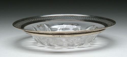 CUT GLASS BOWL WITH STERLING SILVER RIM. Beautiful bowl is intaglio cut with strawberries and leaves having original sterling silver reticulated rim monogrammed with initials "E B". SIZE: 11 in. dia. CONDITION: Very good to excellent. Estate of Edwin Schiebel Sr. 5-60130
