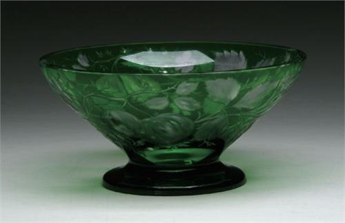 CUT GLASS BOWL. Wonderful bowl is green cut to clear intaglio design with a decoration of fruits, leaves and blossoms. SIZE: 10 in. dia x 5 in. t. CONDITION: Very good to excellent. Estate of Edwin Schiebel Sr. 5-60120