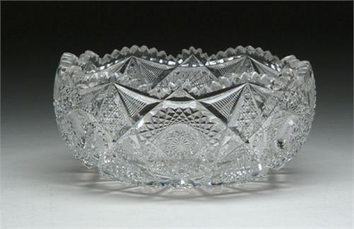 CUT GLASS BOWL. Bowl is cut in hobstar and cane pattern. SIZE: 8 in. dia. CONDITION: Minor edge roughness, otherwise very good to excellent. Estate of Edwin Schiebel Sr. 5-60205