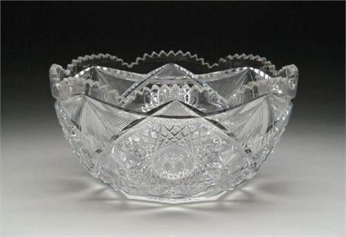 CUT GLASS PUNCHBOWL. Punchbowl is cut in hobstar, fan and crosshatching pattern. Signed "Strause" (star in circle). SIZE: 13 in. dia x 7" in. t. CONDITION: Minor edge roughness, otherwise very good. Estate of Edwin Schiebel Sr. 5-60063