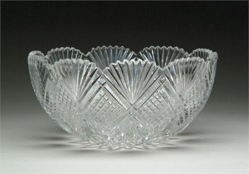 CUT GLASS PUNCHBOWL. Punchbowl is cut in strawberry diamond and fan pattern. SIZE: 12 in. dia x 5-3/4 in. t. CONDITION: Minor edge roughness, otherwise very good. Estate of Edwin Schiebel Sr. 5-60065