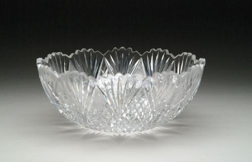 CUT GLASS PUNCHBOWL. Wonderful punchbowl is cut in strawberry diamond and fan pattern. SIZE: 12 in. dia x 5 in. t. CONDITION: Very good to excellent. Estate of Edwin Schiebel Sr. 5-60061