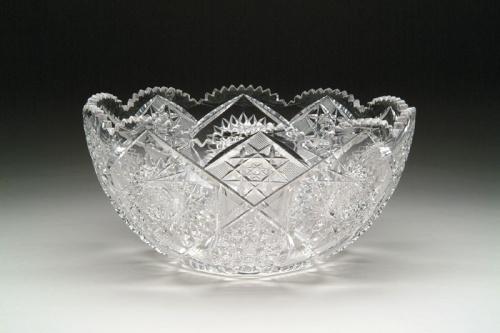 CUT GLASS PUNCHBOWL. Nice cut glass punchbowl is cut in hobstar and cane pattern. SIZE: 14-1/4 in. dia x 7 in. t. CONDITION: One chipped tooth, otherwise very good. Estate of Edwin Schiebel Sr. 5-60057