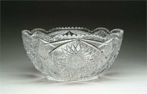 CUT GLASS PUNCHBOWL. Large cut glass punchbowl cut in hobstar, crosshatching and strawberry diamond patterns. SIZE: 14 in. dia. CONDITION: Minor edge roughness, otherwise very good to excellent. Estate of Edwin Schiebel Sr. 5-60055