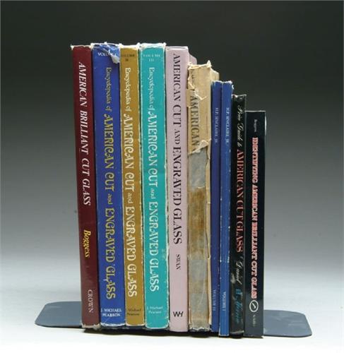 CUT GLASS REFERENCE BOOKS. Fine lot consists of ten cut glass reference books including "Price Guide to American Cut Glass" by Daniel, "Identifying American Brilliant Cut Glass" by Boggess, "H. P. Sinclaire, Jr: Glassmaker Vol. I and II", "American Cut and Engraved Glass" by Swan, "Encyclopedia of American, Cut and Engraved Glass Vol. I, II, III" by Pearson, "American Brilliant Cut Glass" by Boggess and "American Cut Glass for the Discriminating Collector" by Pearson. CONDITION: Books have been used, but overall good. Estate of Edwin Schiebel Sr. 5-60240